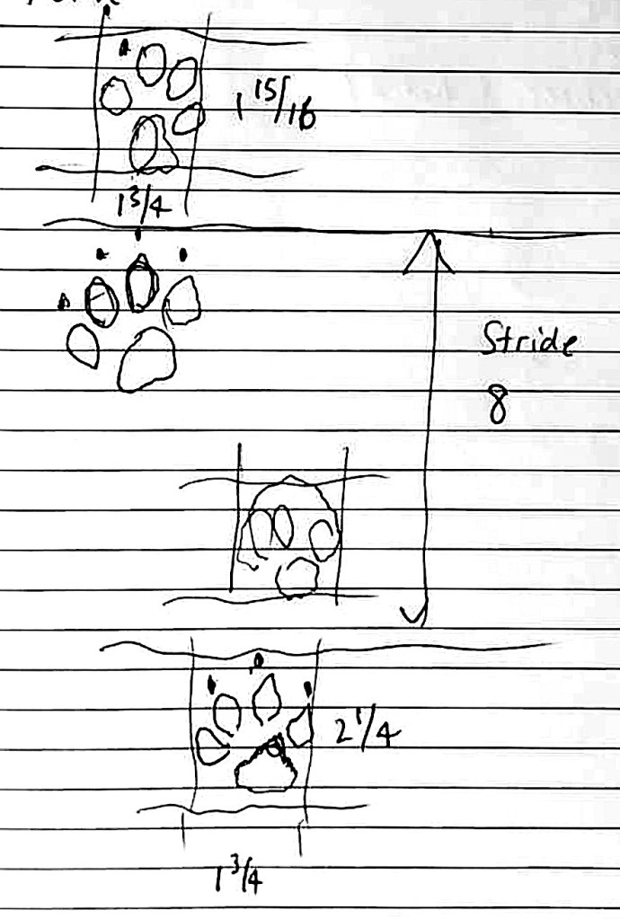 Comparing these measurements with the ones I made, mine seem a little small. This made me think that maybe I was seeing the tracks of a fox. In the Austin area they have both the Red Fox and the Gray Fox. In the Austin area the Red Fox is only just within its range and it usually walks in direct register, and has a chevron-shaped heel pad (Lowery), so I don’t think it’s a Red Fox. The range of the Gray Fox easily covers the Austin area, but this fox has semi-retractile claws so the claws rarely show (Lowery), which seems to also exclude this fox. Thus by a process of elimination my best guess is that this is a domestic dog.