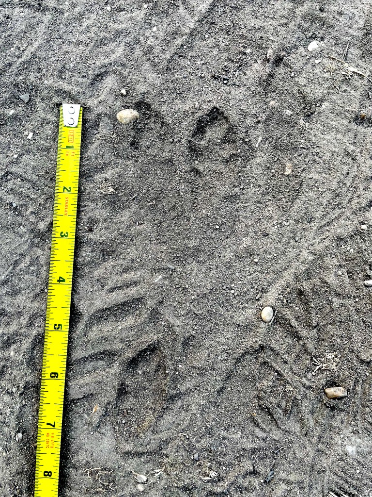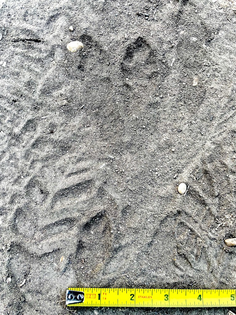 There were numerous Canid (dog family) tracks along the river and I was having trouble deciding whether they were domestic dog or coyote. I new there were coyotes present because of the large dog-like scat around full of hair: