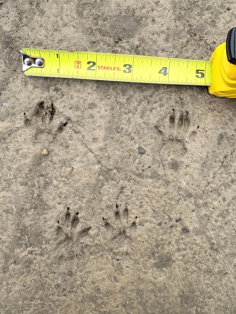 Measurements are all consistent with those in Lowery and Elbroch. Tracks come to a point at the forward edge of tracks. 5 toes on the front foot, but toe 1 is greatly reduced and not always seen. We do see this toe in the lowest (front) track of the first three photos above. Hind tracks show 4 toes. I guess to all intents and purposes we can assume there will be 4 toes front and back, and maybe even fewer than 4 toes may show. The tracks are very asymmetric. Note: Lowery calls the above gait a gallop, however I think Elbroch’s designation of a bound is more accurate.