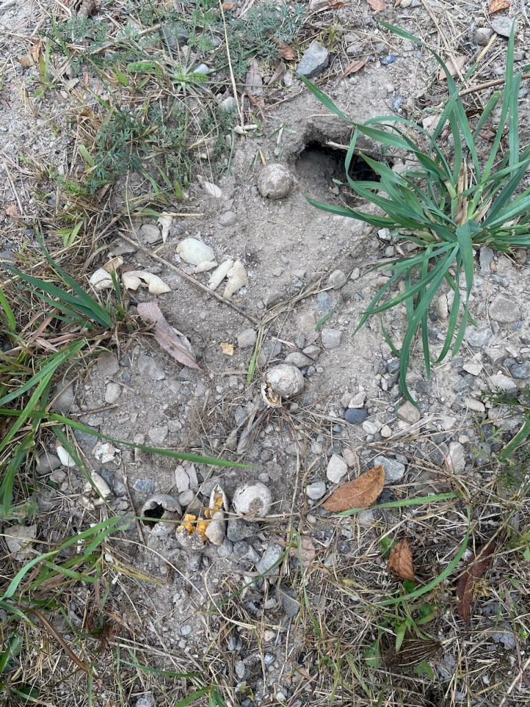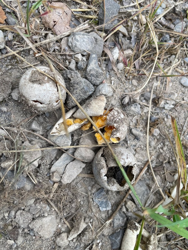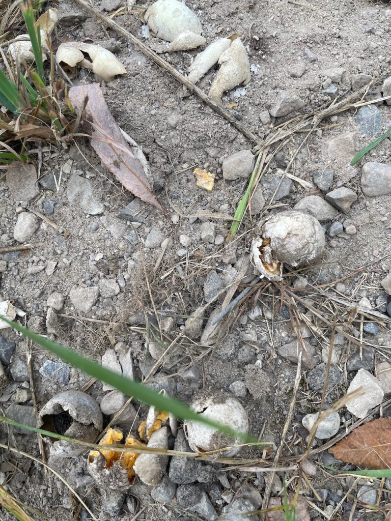 Discussion: Last Fall I saw some snapping turtle nests that had been dug up by a predator. These were on the edge of the Eramosa River (maybe 20 feet from the water) in sandy soil. The snapping turtle is Ontario’s largest freshwater turtle. Snapping turtles lay round eggs, whereas other Ontario turtle species lay oval-shaped eggs. The typical predators that may dig up a turtle nest include crows, American mink, skunks, foxes, and raccoons.