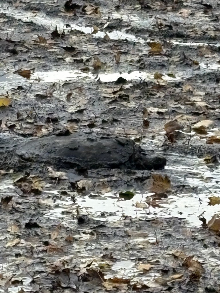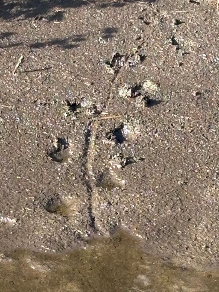 I could not take a picture with my tape ruler. I tried to get close but starting sinking in the mud and lost my boots for a while. I estimated the trail width to be about 6 inches or more. The trail pattern is consistent with that made by a snapping turtle (see Tkaczyk, pp. 333 – 335). The turtle is doing an understep walk (of course it’s impossible for a turtle to do an overstep walk!). The tail drag is very prominent, which is again typical for this turtle. According to Tkaczyk, “When this species walks, it usually carries its shell well above the ground on fully extended legs”. Again, this seems consistent with what I see – there is no apparent plastron drag. The snapping turtle has five toes on the front and hind feet, but generally only four toes register on the hind feet. According to Halfpenny, front prints toe in and hind prints may toe out. The pictures below are from Halfpenny.