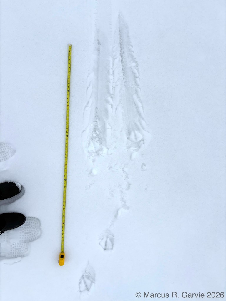 Several years ago, I discovered amazing tracks on a golf course, where Canada Geese had landed in the snow, leaving long skid marks. I decided to see if I could find that again. I started walking around the edge of the golf course, as it is usually the transition areas where most animal tracks are found. Apart from numerous signs of Gray Squirrels searching for and digging up nuts, there were few tracks found.