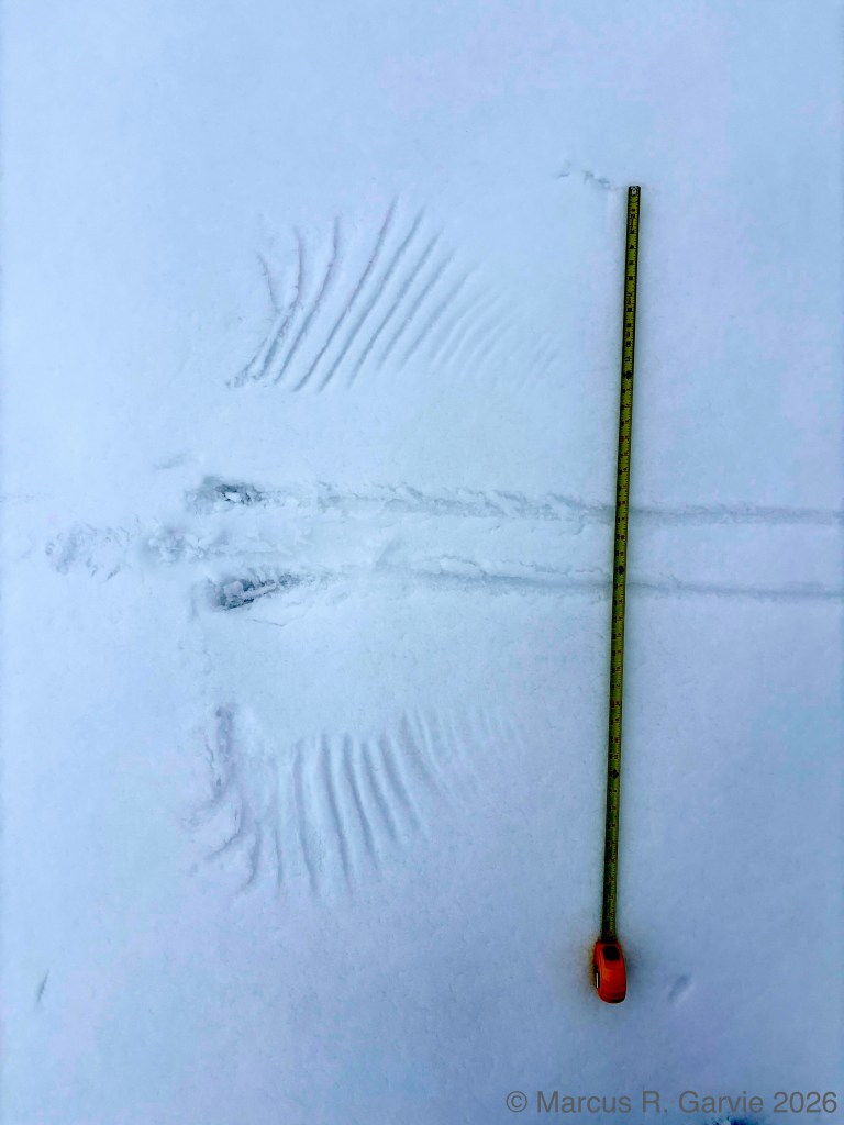 In the first picture, the direction of travel is from bottom to top, while in the second picture it is reversed. On a small slope, I then found remarkably clear wing imprints where a goose attempted to land, skidded, and then took off again. There were no prints immediately before or after this pattern, but some 20–30 feet ahead were what were presumably the landing tracks of this bird.