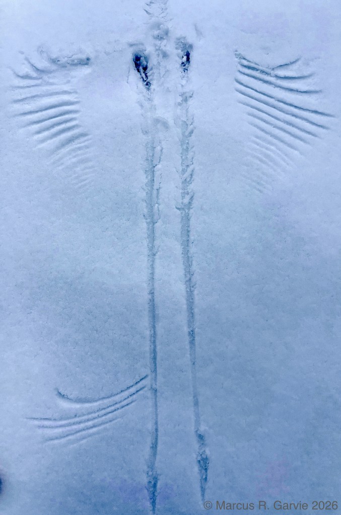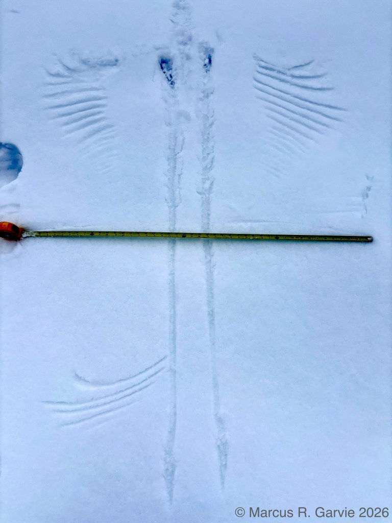 I texted Byron Murray about the goose wing prints, and he came immediately to see them. I had to leave to pick my son up from school, but Byron followed the raccoon trail and actually found the animal in a hollow tree – you could just see the tail and some of the fur (photo not included).