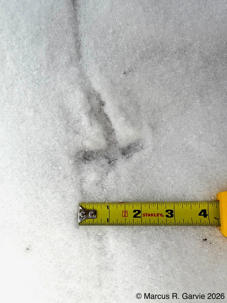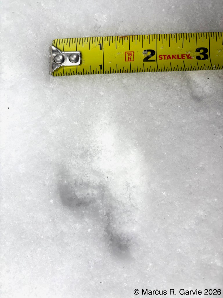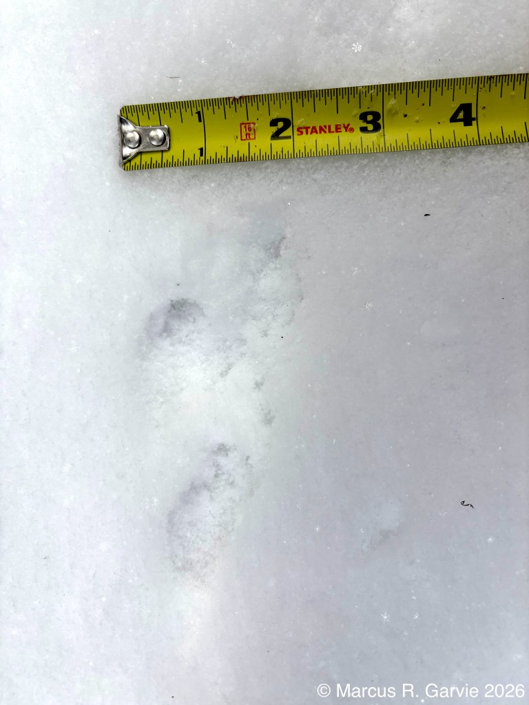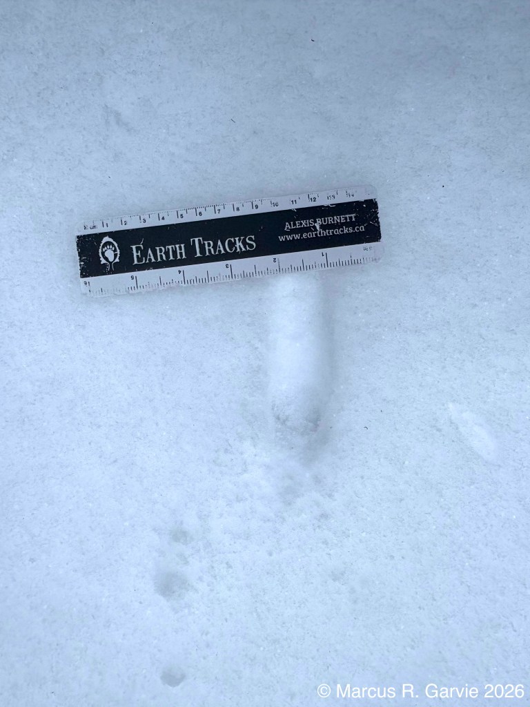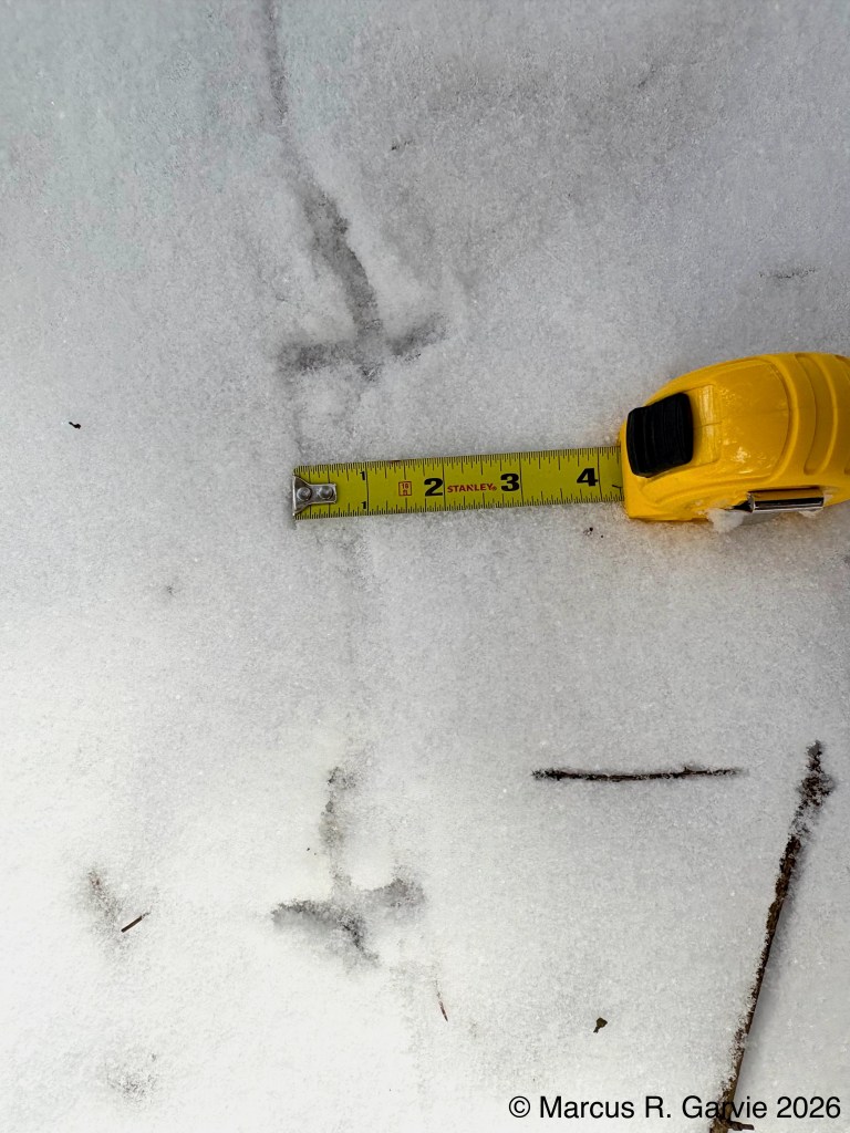 One of the things I learned is that these tracks form what look like arrows in the snow that point in the opposite direction of travel. This is because the hallux (toe 1) is much smaller than toe 3, while toes 2 and 4 point to the sides and forward, producing a typical anisodactyl track pattern. This is useful because, even when individual tracks are less clear than those shown here, the basic arrow shape is often still visible. When conditions are very poor, the pattern may reduce to a railway-like impression, with two parallel lines crossed by regularly spaced perpendicular marks (see the first picture above). The following measurements are from [3]