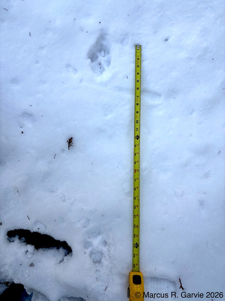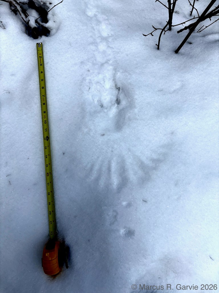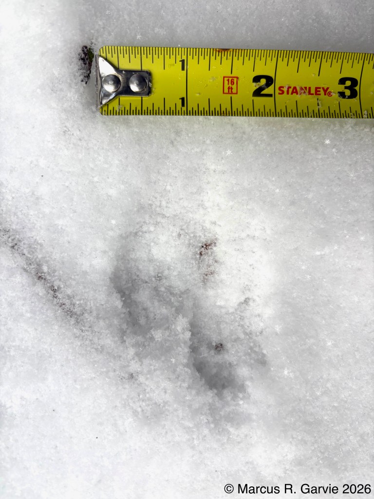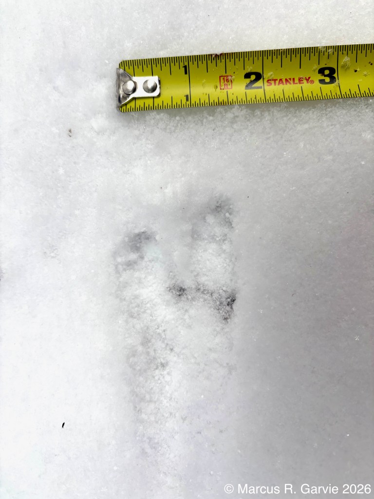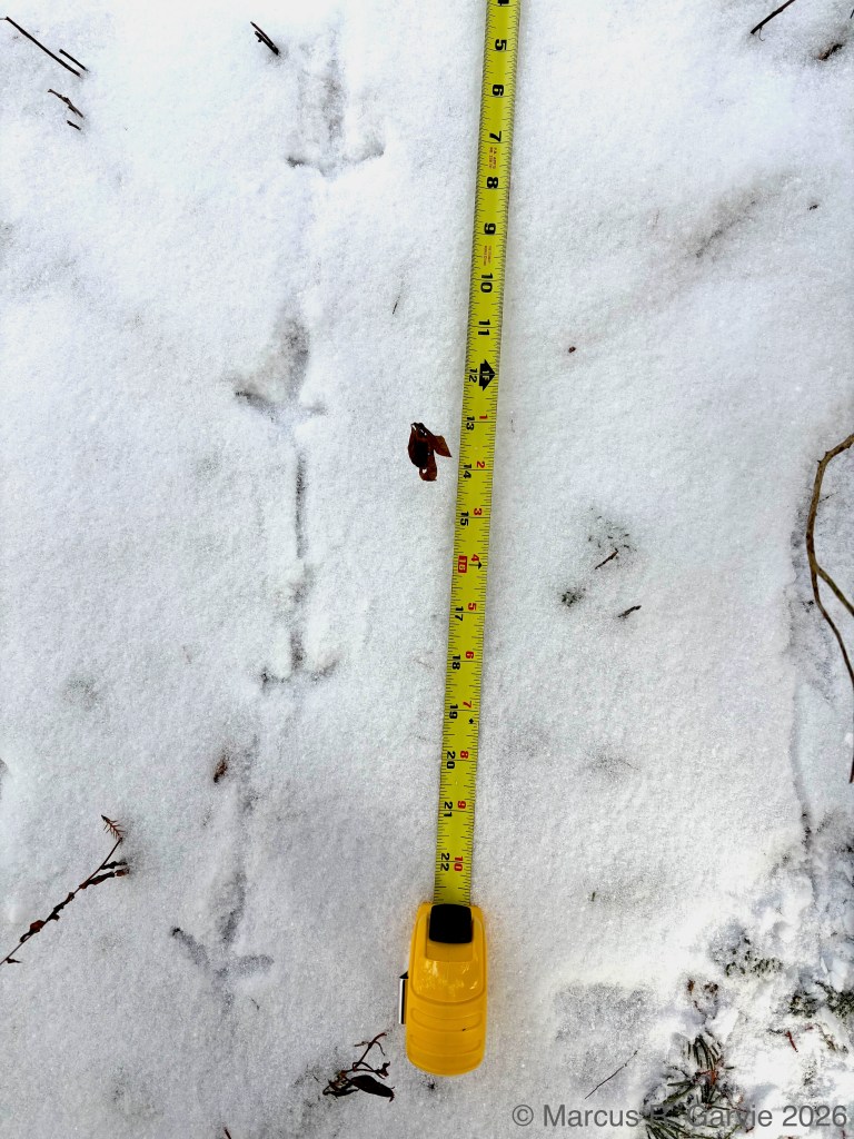 One of the things I learned is that these tracks form what look like arrows in the snow that point in the opposite direction of travel. This is because the hallux (toe 1) is much smaller than toe 3, while toes 2 and 4 point to the sides and forward, producing a typical anisodactyl track pattern. This is useful because, even when individual tracks are less clear than those shown here, the basic arrow shape is often still visible. When conditions are very poor, the pattern may reduce to a railway-like impression, with two parallel lines crossed by regularly spaced perpendicular marks (see the first picture above). The following measurements are from [3]
