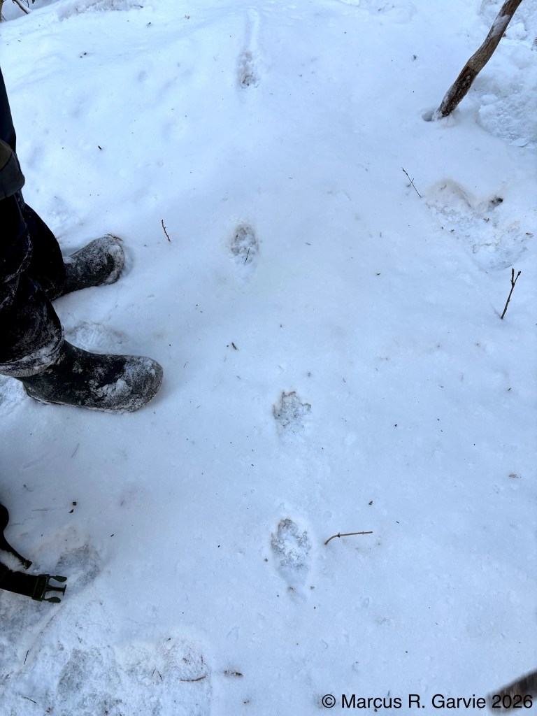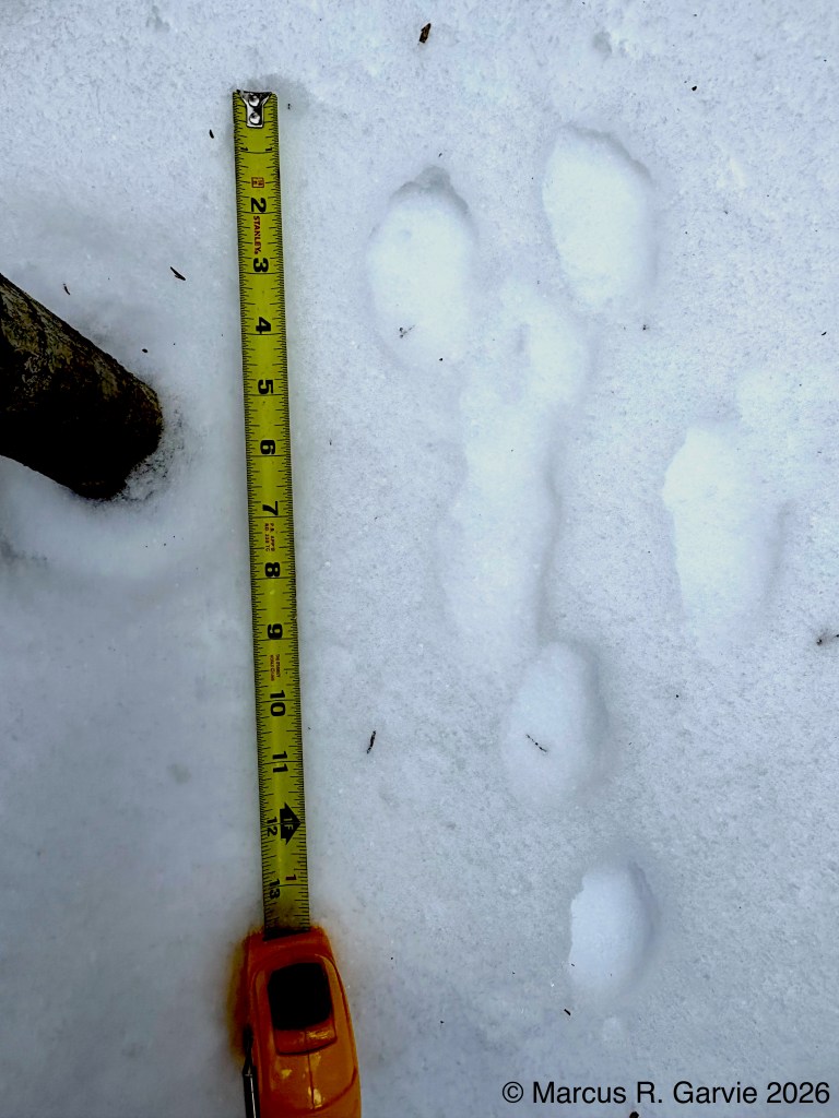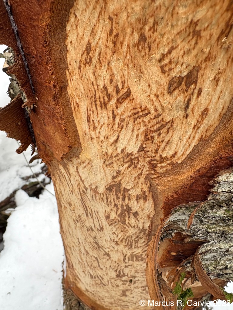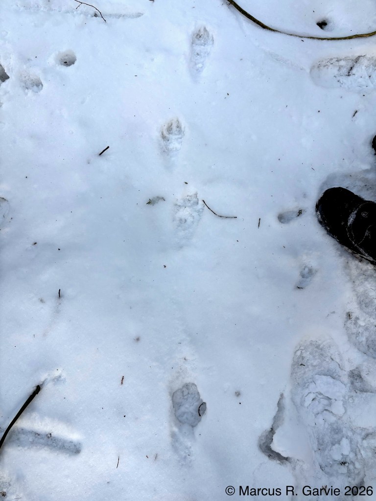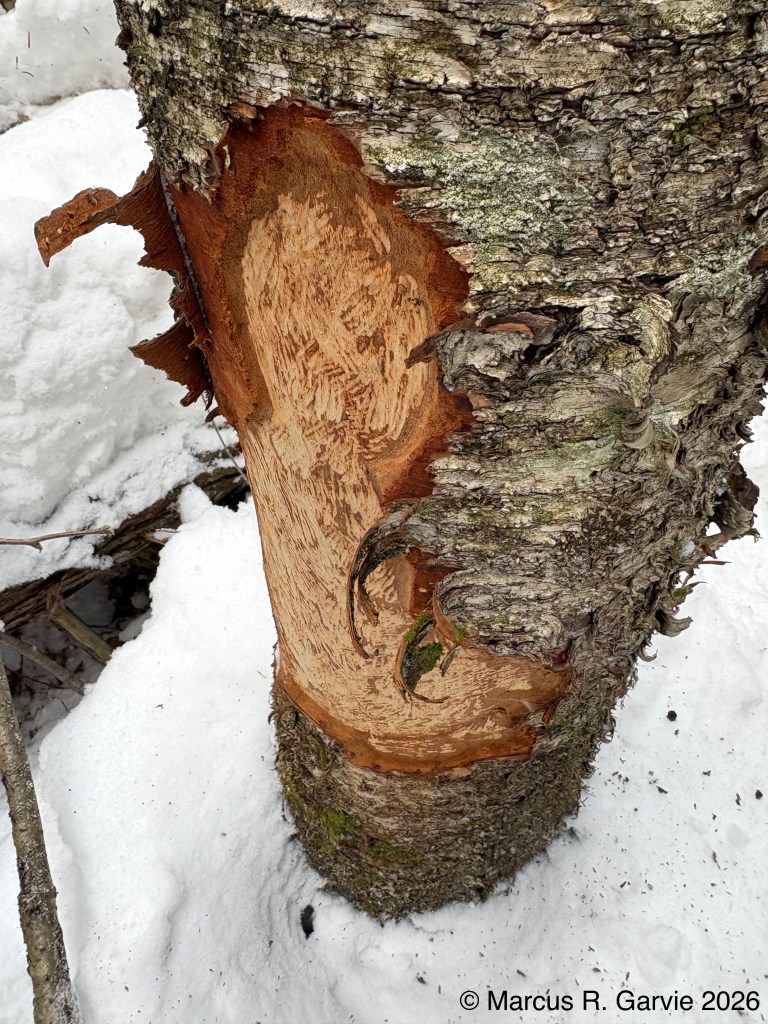 We also found porcupine chew marks on Yellow Birch and tracks of a Red Squirrel. The porcupine had been feeding on the cambium layer of the bark, and the chew marks are very distinctive. I have included the tracks of a bounding Red Squirrel because, in this photo, the long toes of the front feet are easy to see and help distinguish it from a Gray Squirrel, in addition to the Red Squirrel’s narrower trail width.
