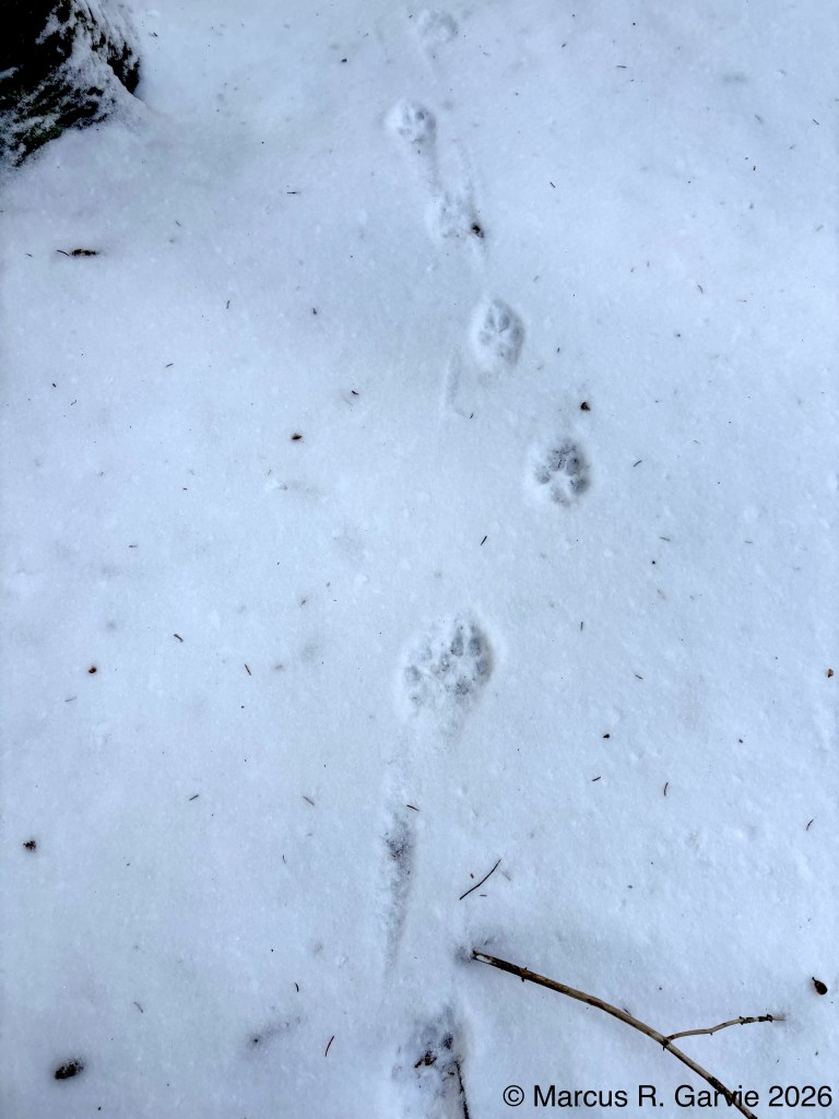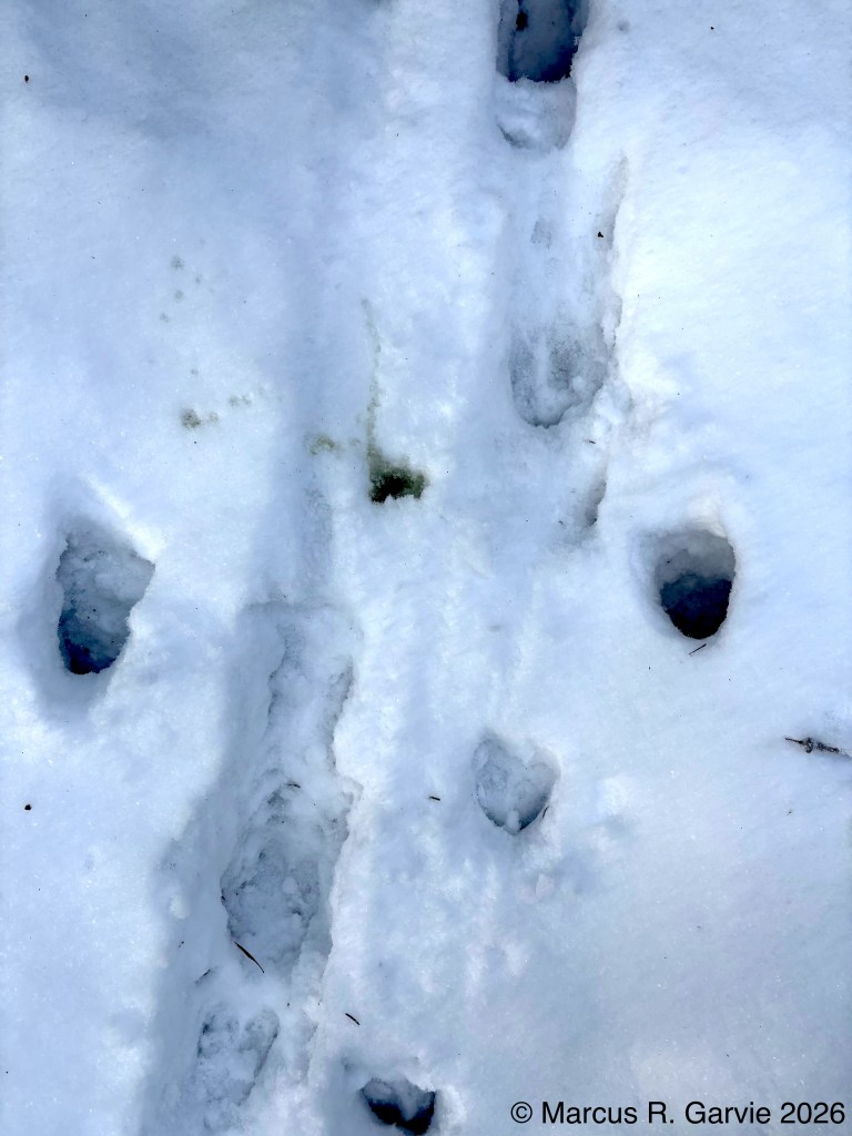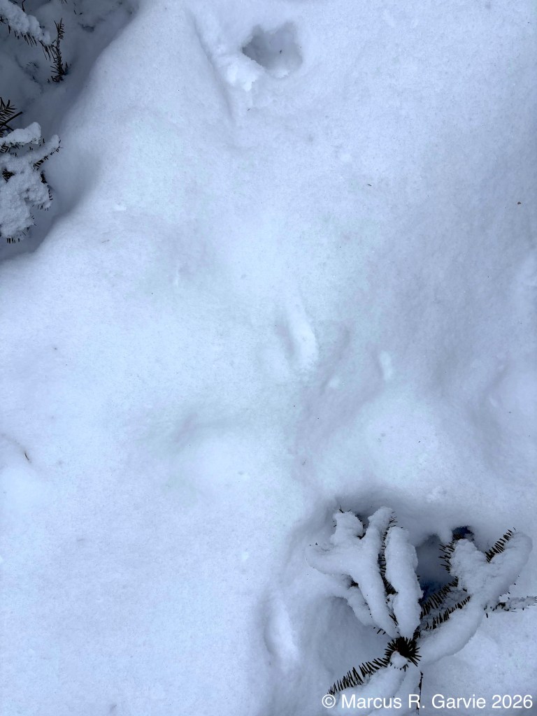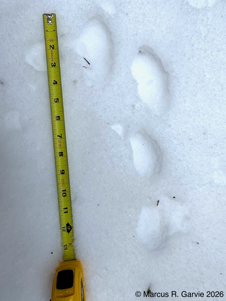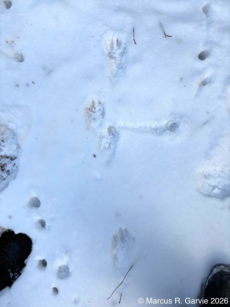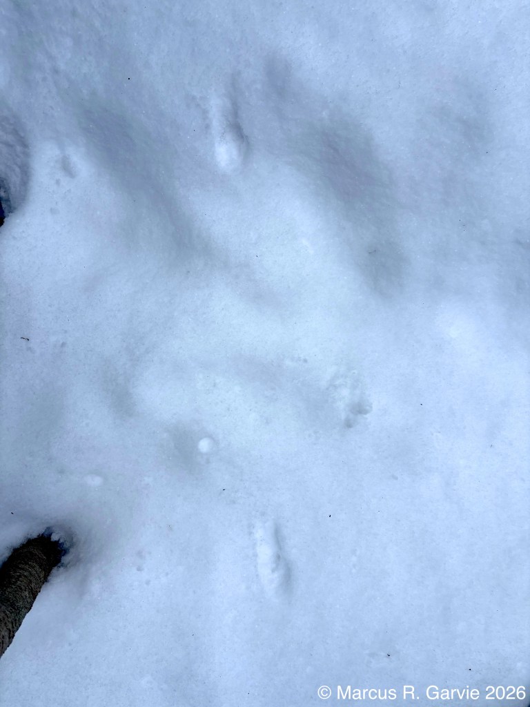 We also found porcupine chew marks on Yellow Birch and tracks of a Red Squirrel. The porcupine had been feeding on the cambium layer of the bark, and the chew marks are very distinctive. I have included the tracks of a bounding Red Squirrel because, in this photo, the long toes of the front feet are easy to see and help distinguish it from a Gray Squirrel, in addition to the Red Squirrel’s narrower trail width.