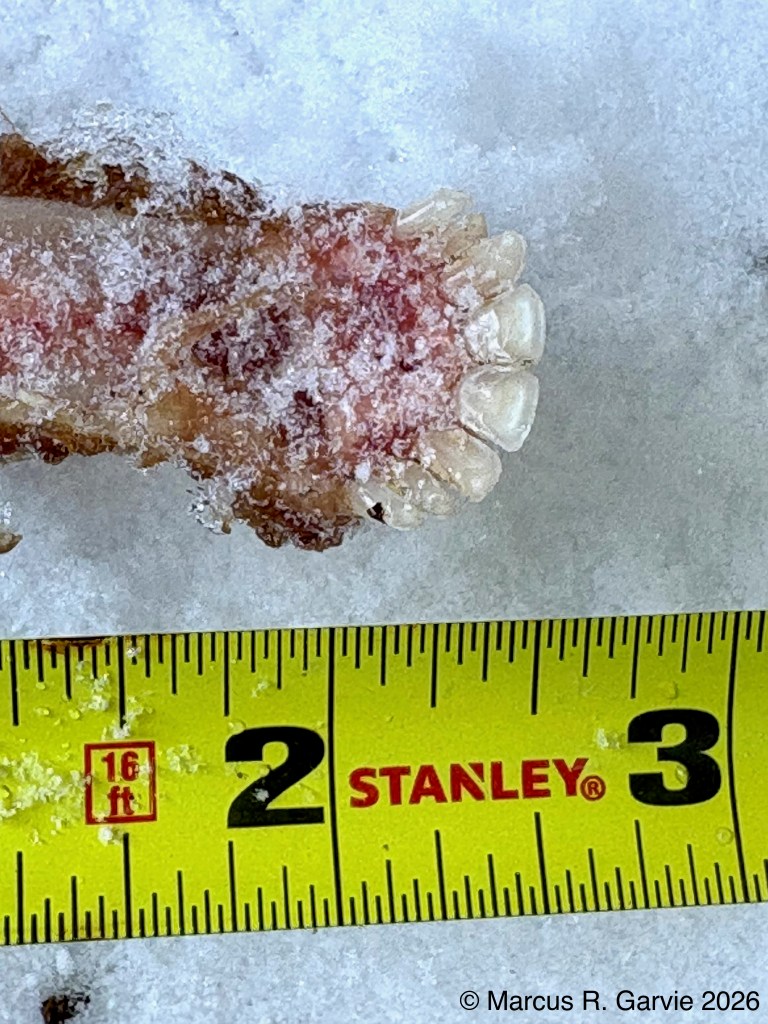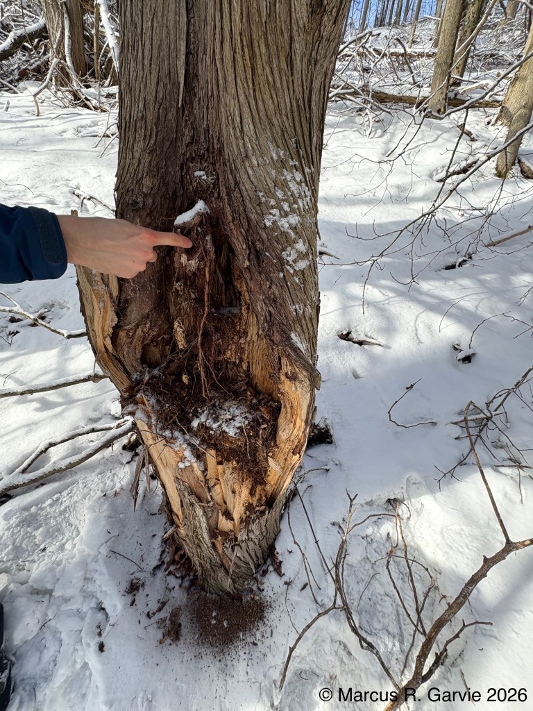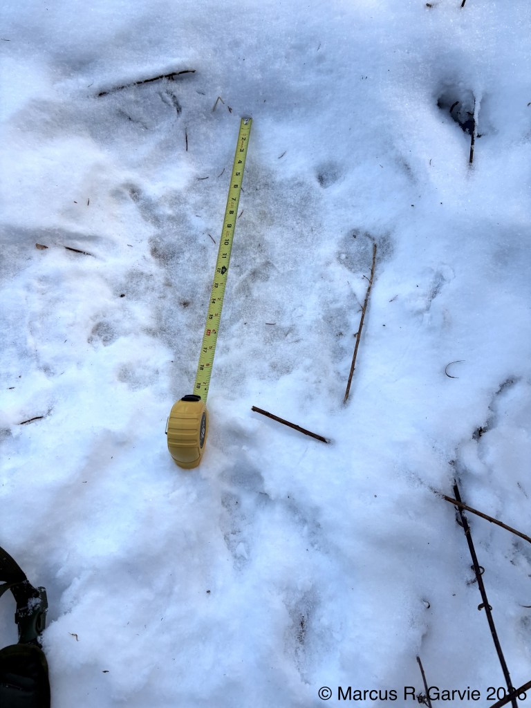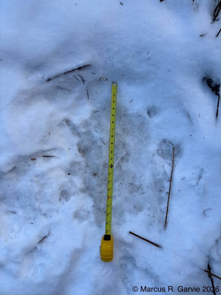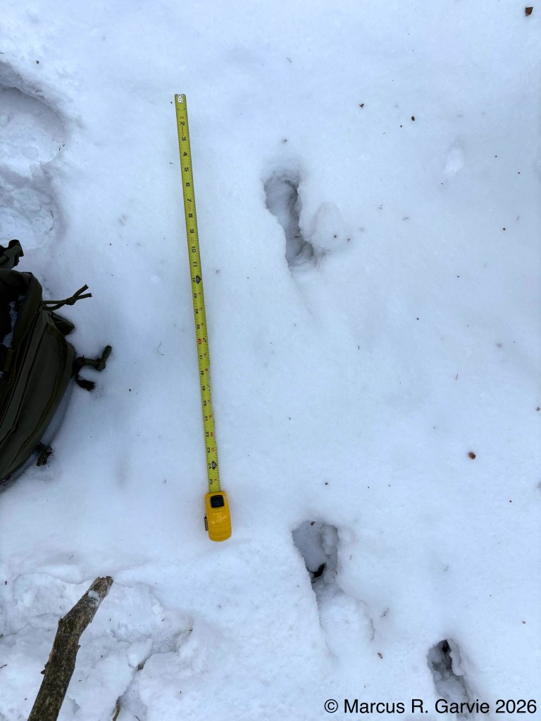 We also found porcupine chew marks on Yellow Birch and tracks of a Red Squirrel. The porcupine had been feeding on the cambium layer of the bark, and the chew marks are very distinctive. I have included the tracks of a bounding Red Squirrel because, in this photo, the long toes of the front feet are easy to see and help distinguish it from a Gray Squirrel, in addition to the Red Squirrel’s narrower trail width.