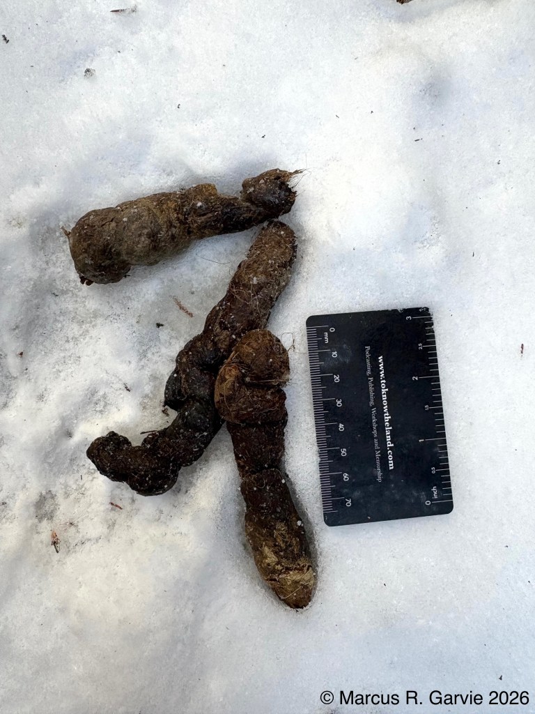We also found fresh scat (not frozen) and coyote beds. The beds are much rounder in shape and smaller (length 17 in) than the deer beds I have seen.