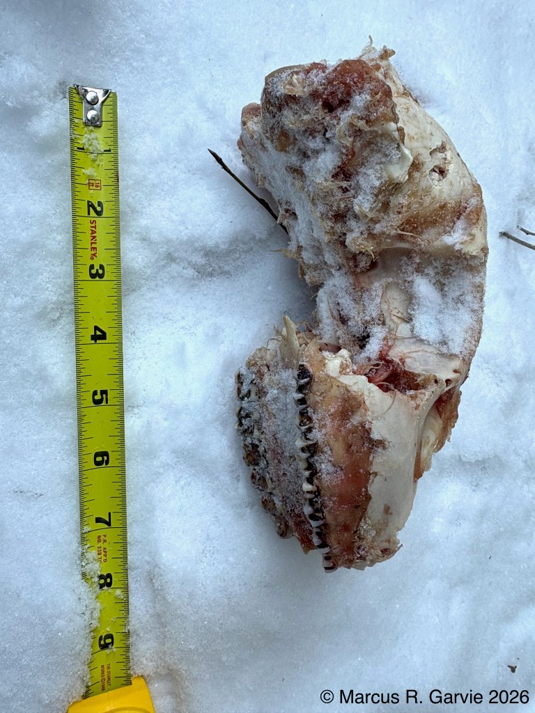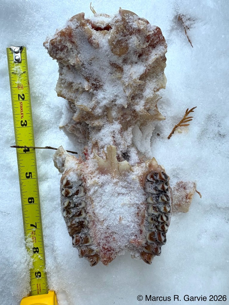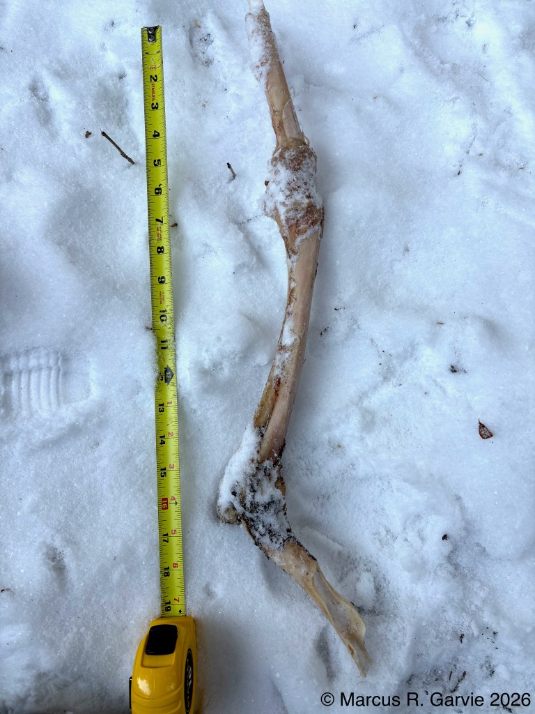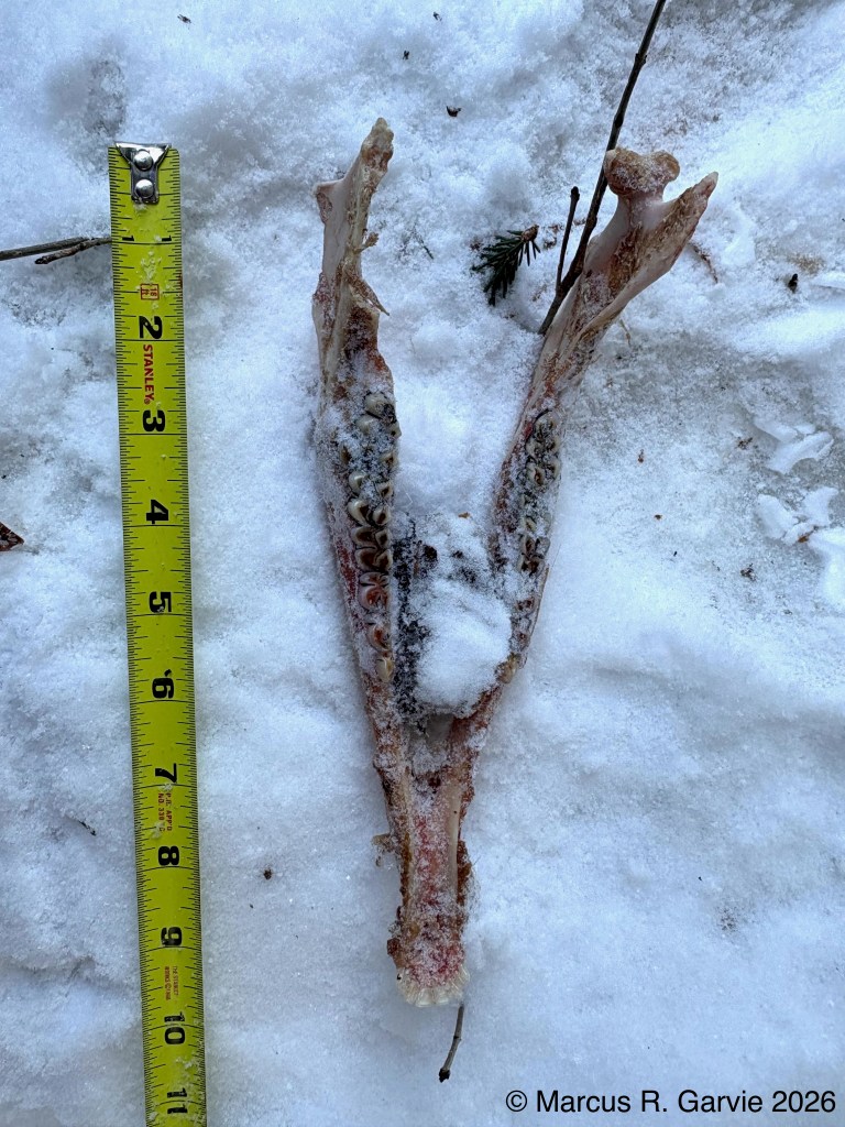 Observe the eight incisors on the lower jaw bone (deer have no incisors on the upper jaw). In the third photo, we see a front leg bone; the hoof was missing, and the bone appeared to have been broken open, likely by a coyote. In the fifth photo, we can see the teeth of the upper jaw. Other members of the tracking group spent some time estimating the deer’s age based on tooth number and patterns of wear, and concluded that the doe was about 5½ years old. I need to learn how to do this myself, as well as the names of the main bones of a deer. The humerus is the upper front-leg bone from shoulder to elbow, the radius is the main weight-bearing bone of the lower front leg, and the ulna is reduced and partly fused to the radius in deer (readers, please correct me if this isn’t accurate!).