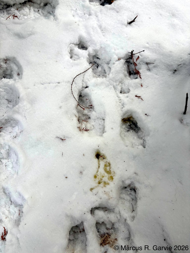In the first photo above, the track has a distinctive hourglass shape, which is often seen in deeper snow. This occurs because a deer’s foot is narrower near the “ankle” and wider both above and below this point. This is a useful diagnostic feature for older tracks, when finer details are obscured. In the second photo, we interpreted the “messier” urination pattern as indicating a male deer, while the “cleaner” pattern in the third photo suggested a female. Another feature that can help distinguish sex is the position of the urine mark relative to the tracks. If the mark lies mainly behind the hind feet, it suggests a female; if it falls between the front and hind feet, it suggests a male. In our two photos above, however, there were so many overlapping tracks that this criterion was difficult to apply.