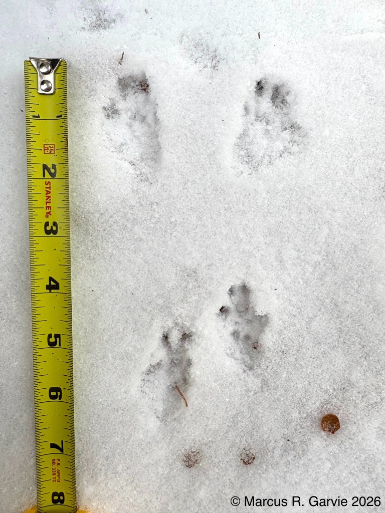 Periodically, we found Snowshoe Hare tracks. According to [1], the hind tracks can be up to 5 inches wide when splayed. The tracks we observed were not splayed, so the hind prints were much narrower. I estimate the hind-track width in my photos to be about 1¾ inches, which is close to the upper end for a cottontail.
