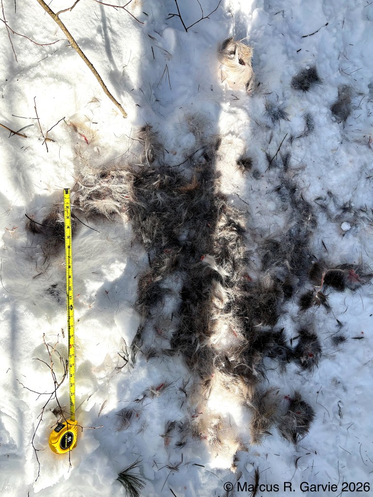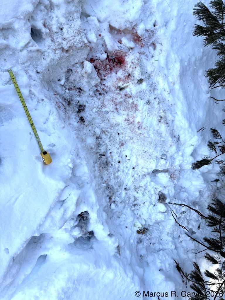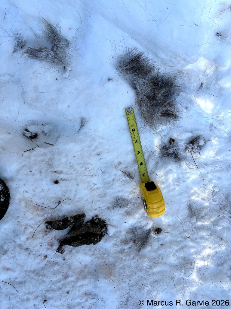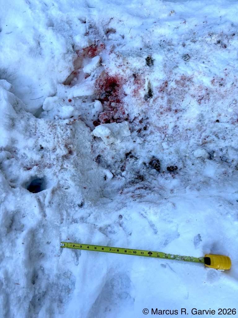 We headed to the wolf kill-site off Highway 60. Climbing up the steep banks of snow on the edge of the highway, there was clear evidence of a kill site, with lots of deer fur, blood, scat and urine.