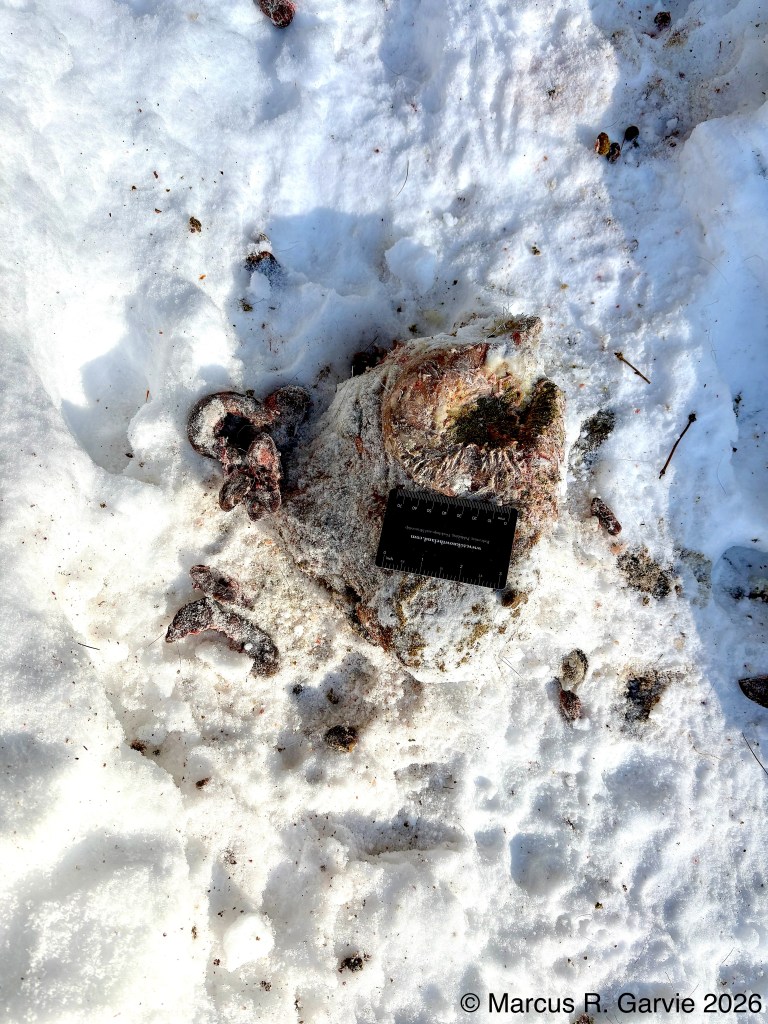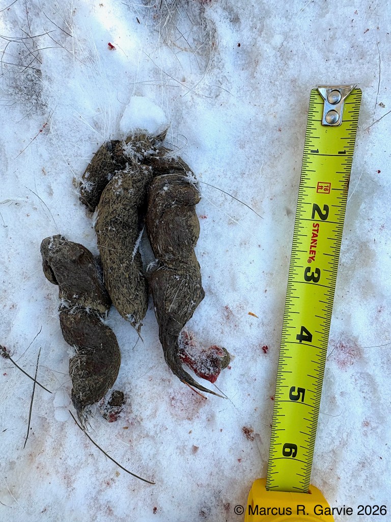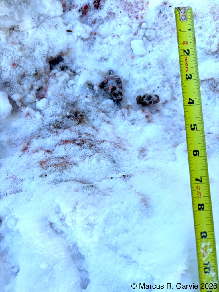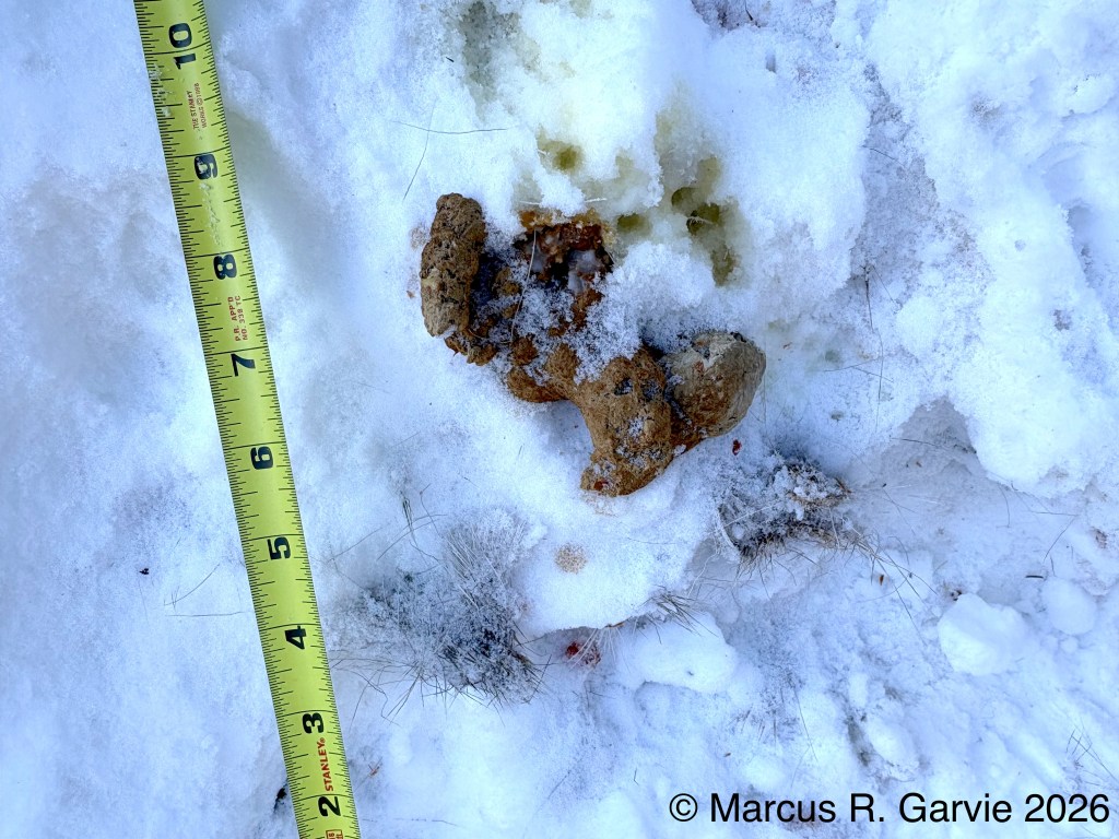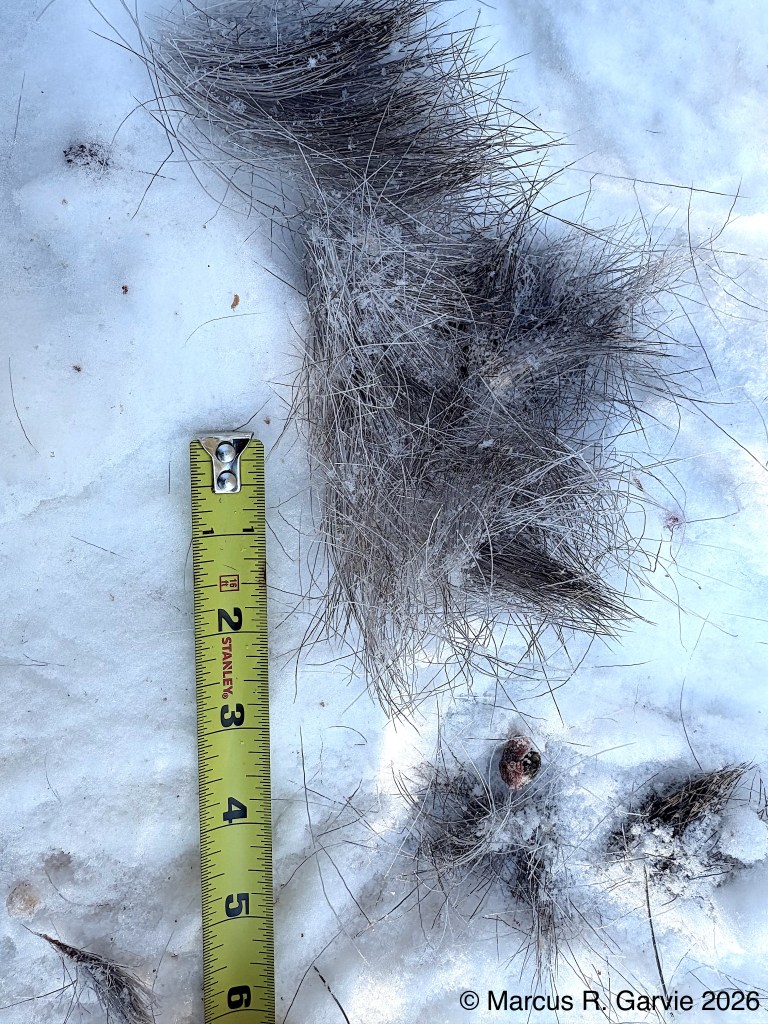 We headed to the wolf kill-site off Highway 60. Climbing up the steep banks of snow on the edge of the highway, there was clear evidence of a kill site, with lots of deer fur, blood, scat and urine.