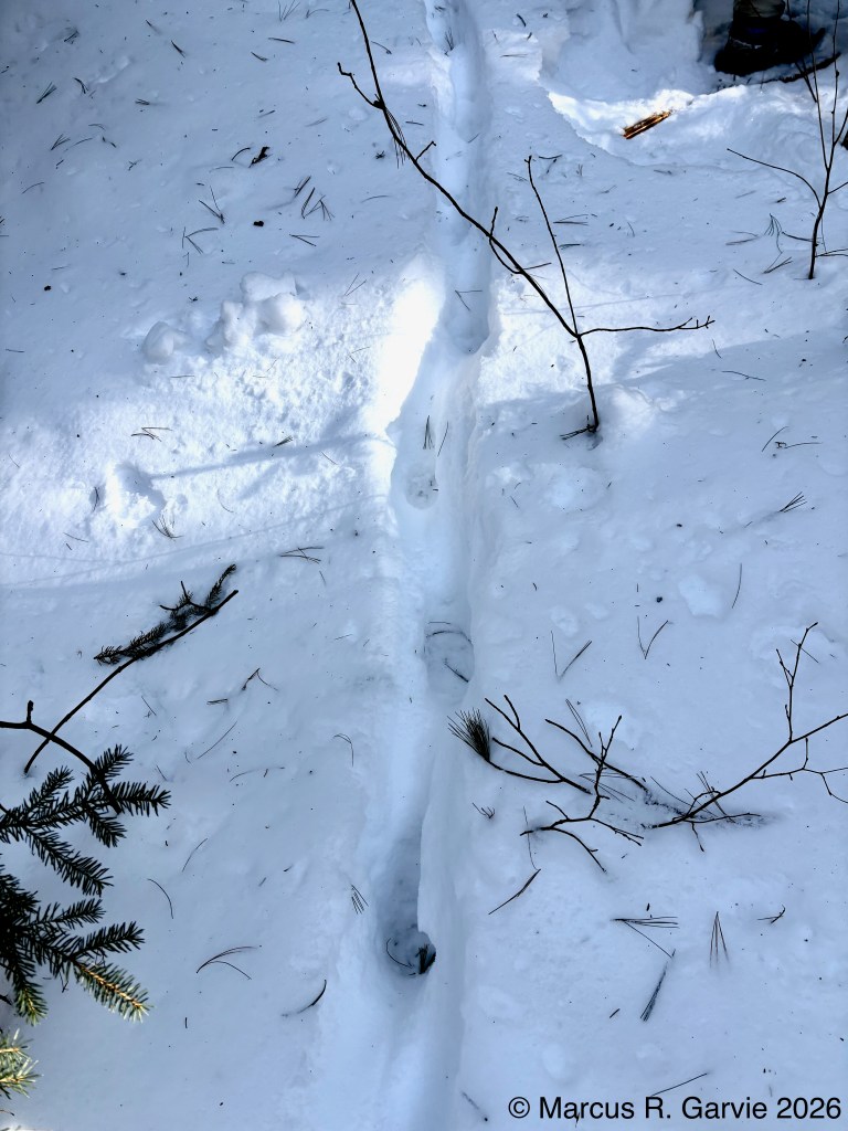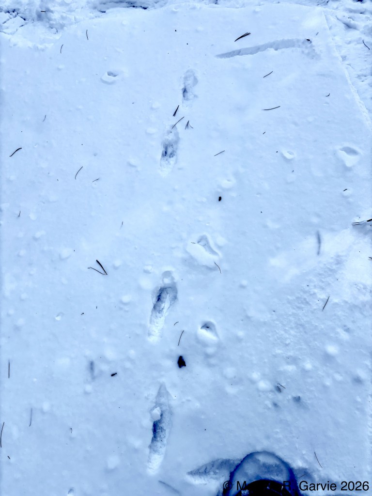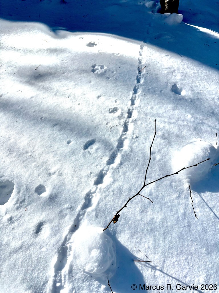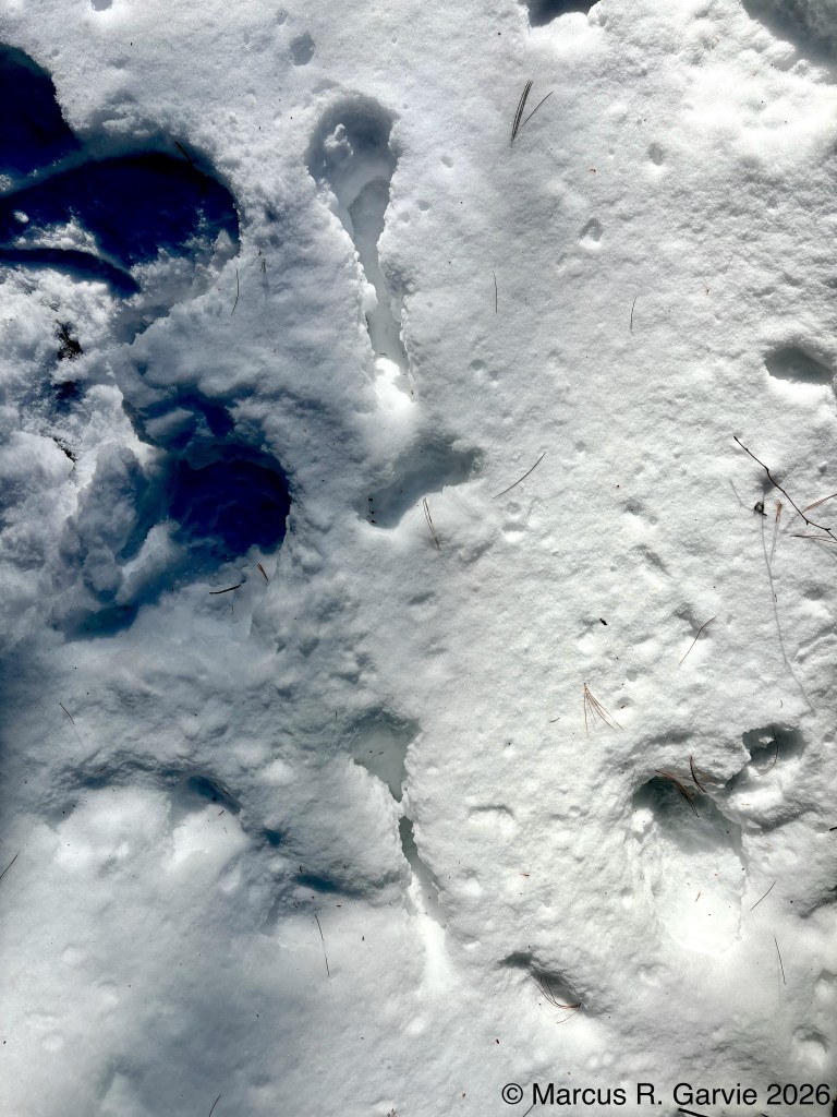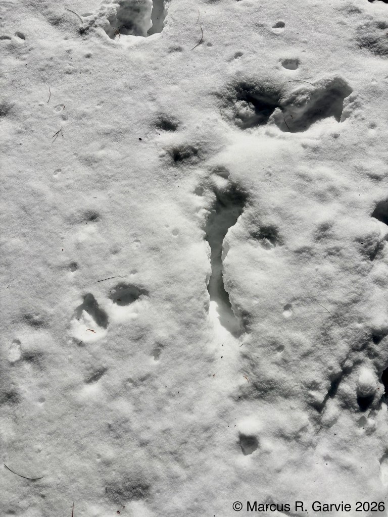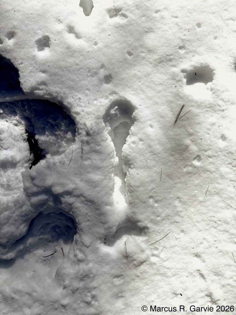 I also observed some nice examples of older deer tracks with an hourglass shape. When a deer steps into deep snow, the hoof first pushes through and makes a larger hole. As the animal drags the foot forward, the narrower ankle makes the thinner middle section. When the hoof lifts out, it enlarges the end of the track again, leaving an hourglass shape.