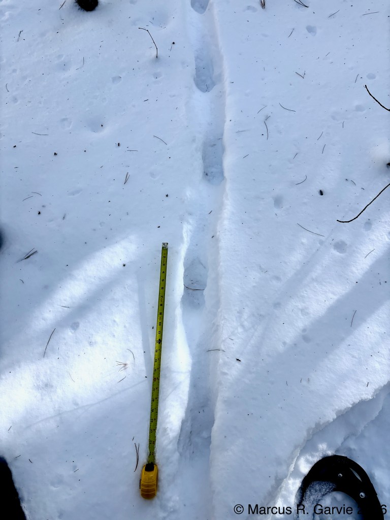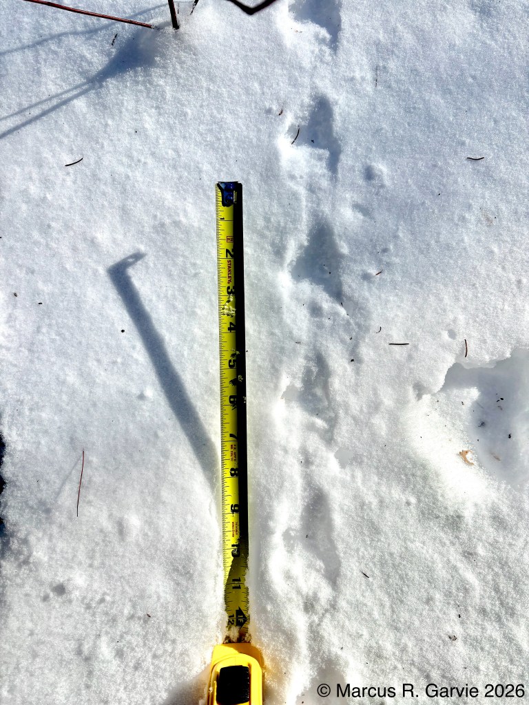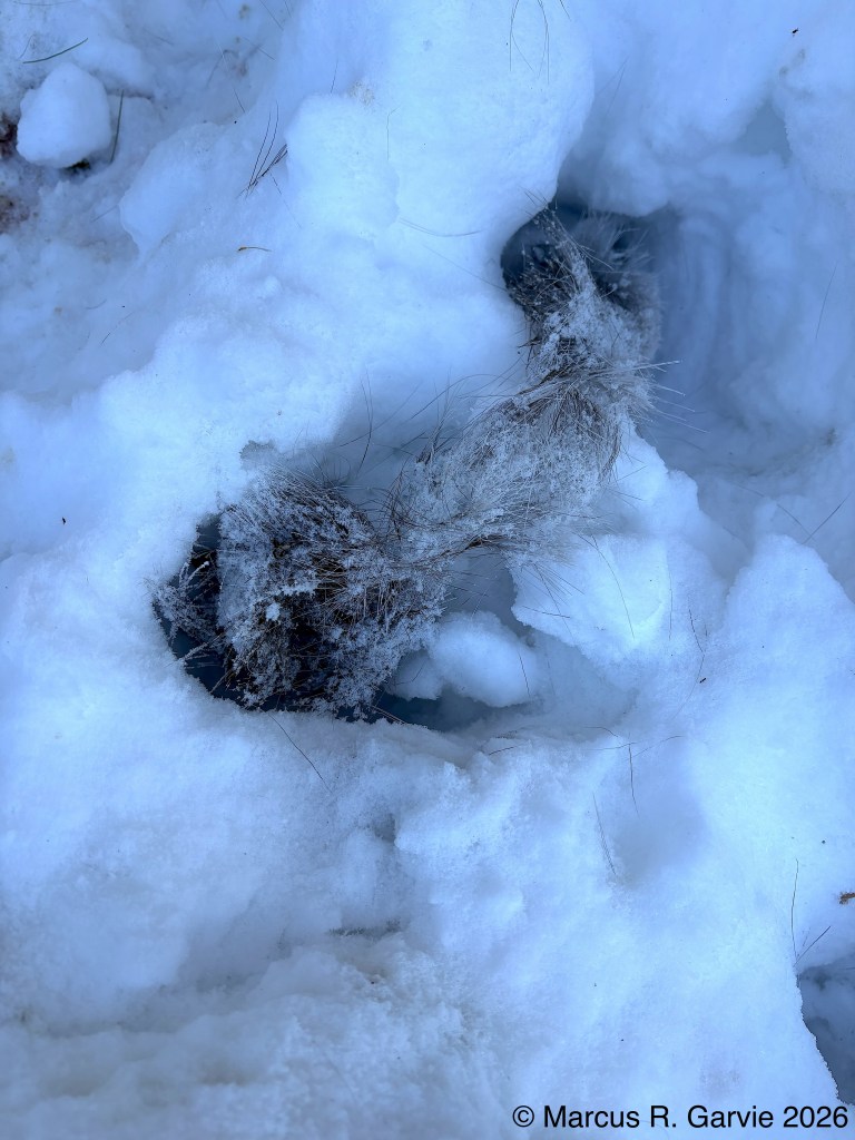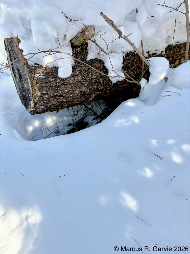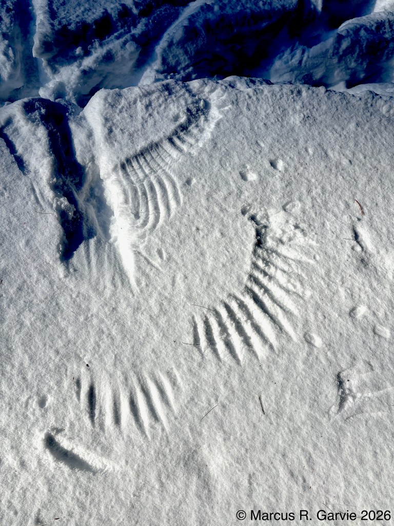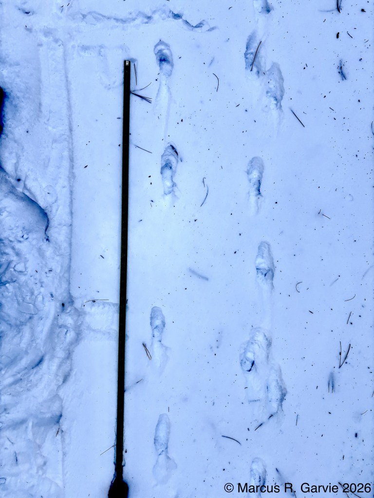 I also observed some nice examples of older deer tracks with an hourglass shape. When a deer steps into deep snow, the hoof first pushes through and makes a larger hole. As the animal drags the foot forward, the narrower ankle makes the thinner middle section. When the hoof lifts out, it enlarges the end of the track again, leaving an hourglass shape.