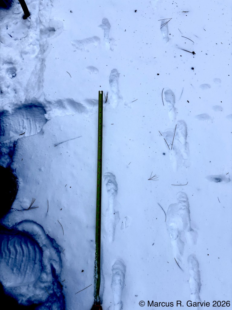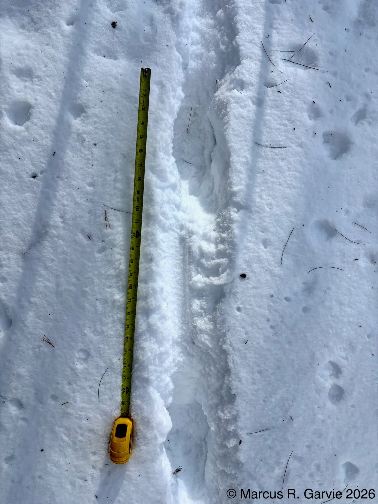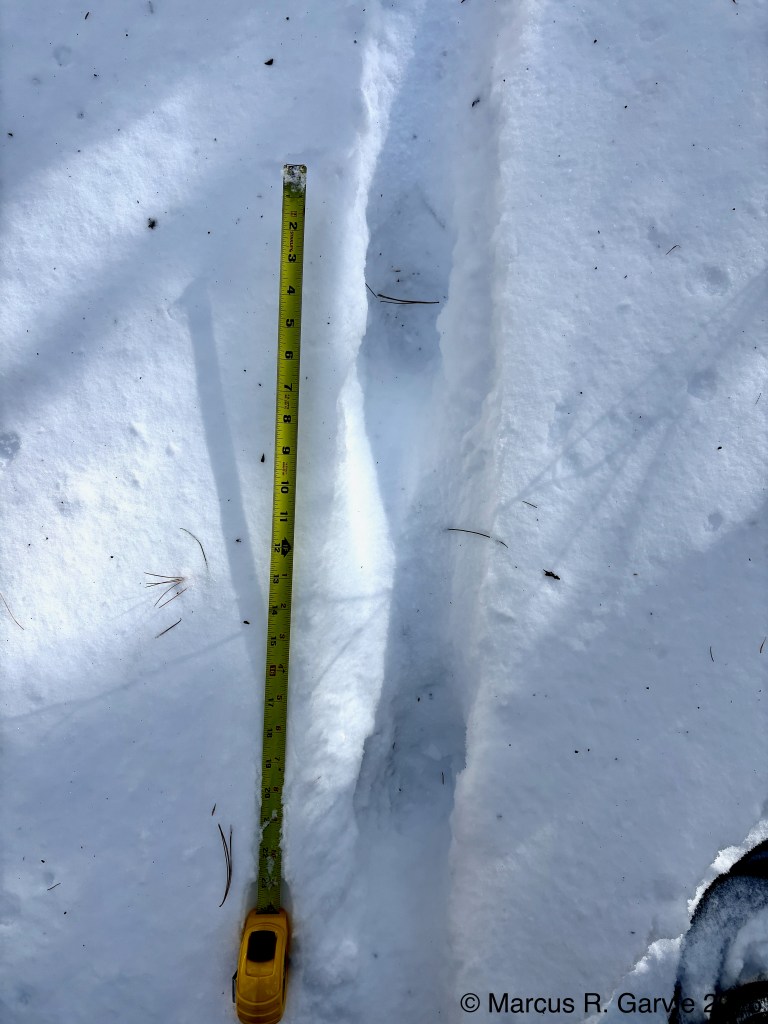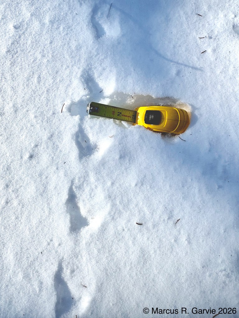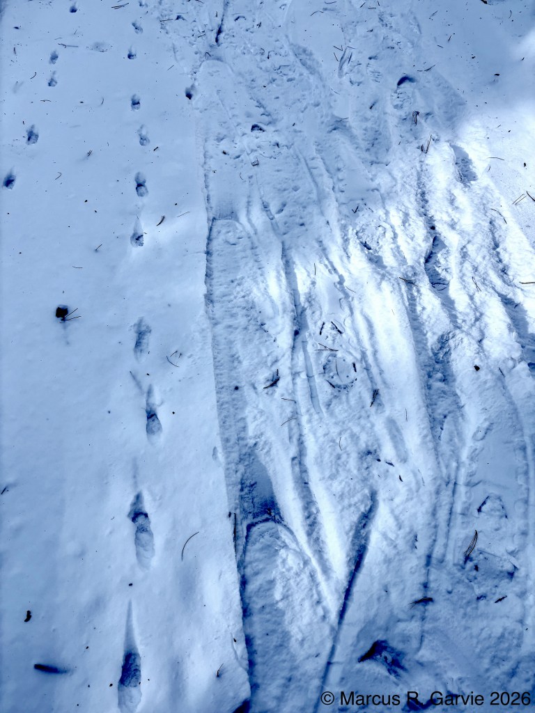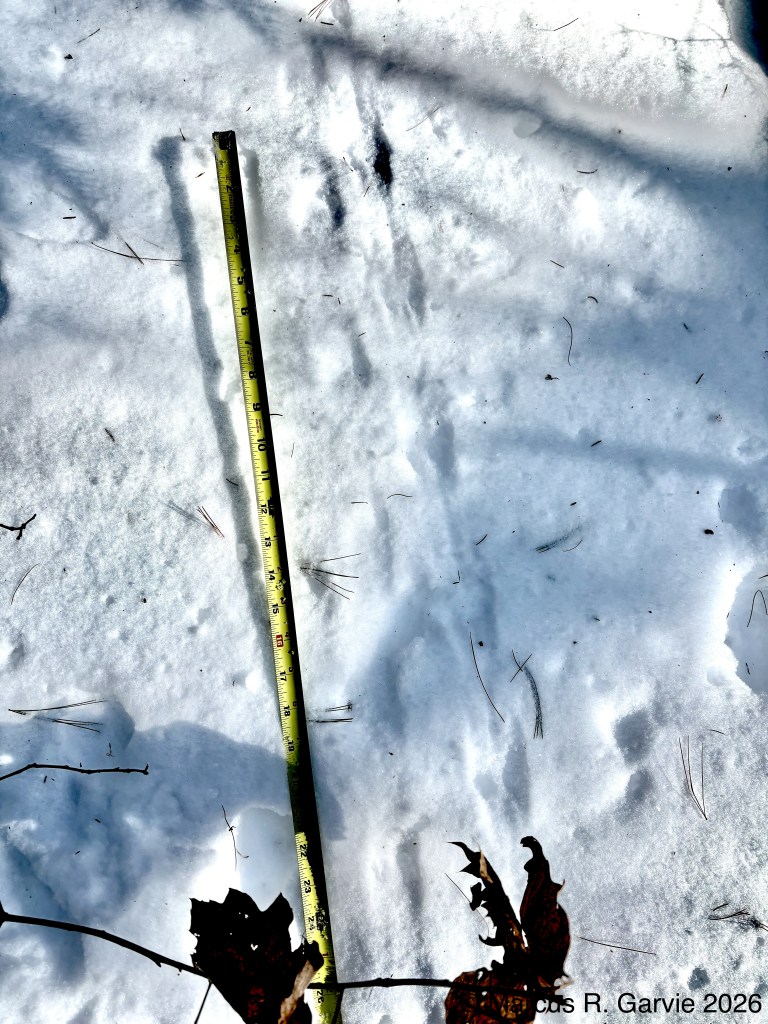 I also observed some nice examples of older deer tracks with an hourglass shape. When a deer steps into deep snow, the hoof first pushes through and makes a larger hole. As the animal drags the foot forward, the narrower ankle makes the thinner middle section. When the hoof lifts out, it enlarges the end of the track again, leaving an hourglass shape.