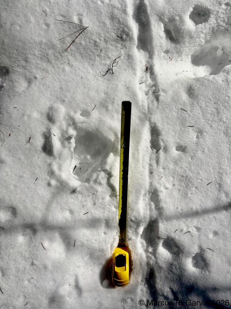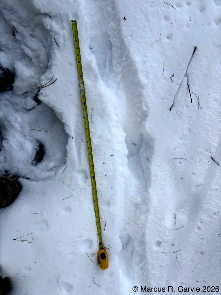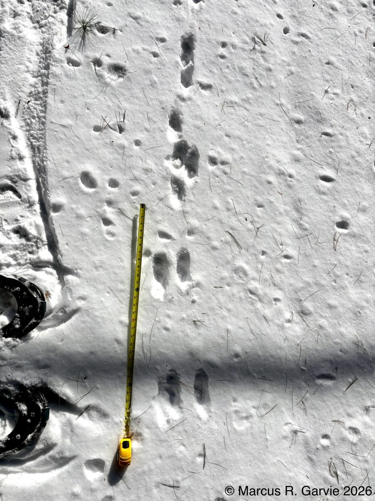 I followed these trails along the rough road away from the highway and noticed that the fox was using a very confusing gait. At first, the tracks appeared in pairs, suggesting a side trot. A side trot is a type of overstep trot, and in my SWOTT tracking course, I learned that “the overstep in a coyote or dog trot will not be more than one third of the step length.” The photos I took clearly show that it is. Furthermore, in a side trot we expect the hind tracks to fall to the outside of the front tracks, so I had to re-evaluate what I was seeing. Careful inspection showed that the tracks were better grouped in fours, with a slightly larger distance between groups than between the front and hind tracks within each group. The gait is what is called a stretch gallop (page 73 of [1], 1st ed.). What makes this confusing is that the tracks lie almost in a straight line, making the groupings hard to see. According to [1], a stretch gallop expresses extreme fear.