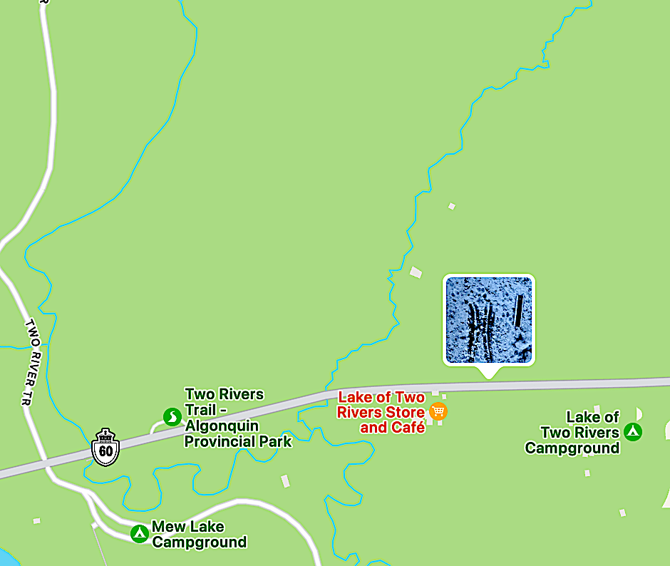 Place: Just east of the Two Rivers Trail on Highway 60, across from the Lake of Two Rivers Store and Cafe. See below: