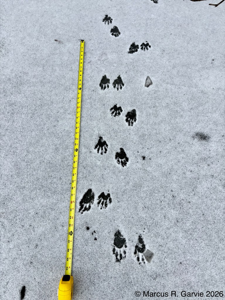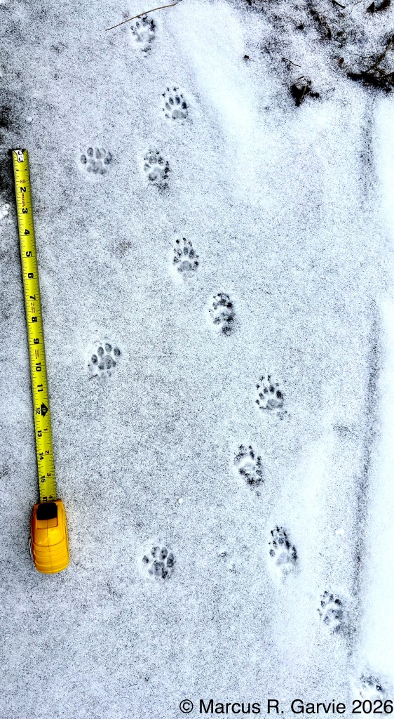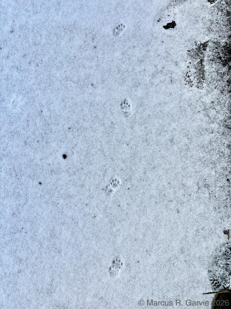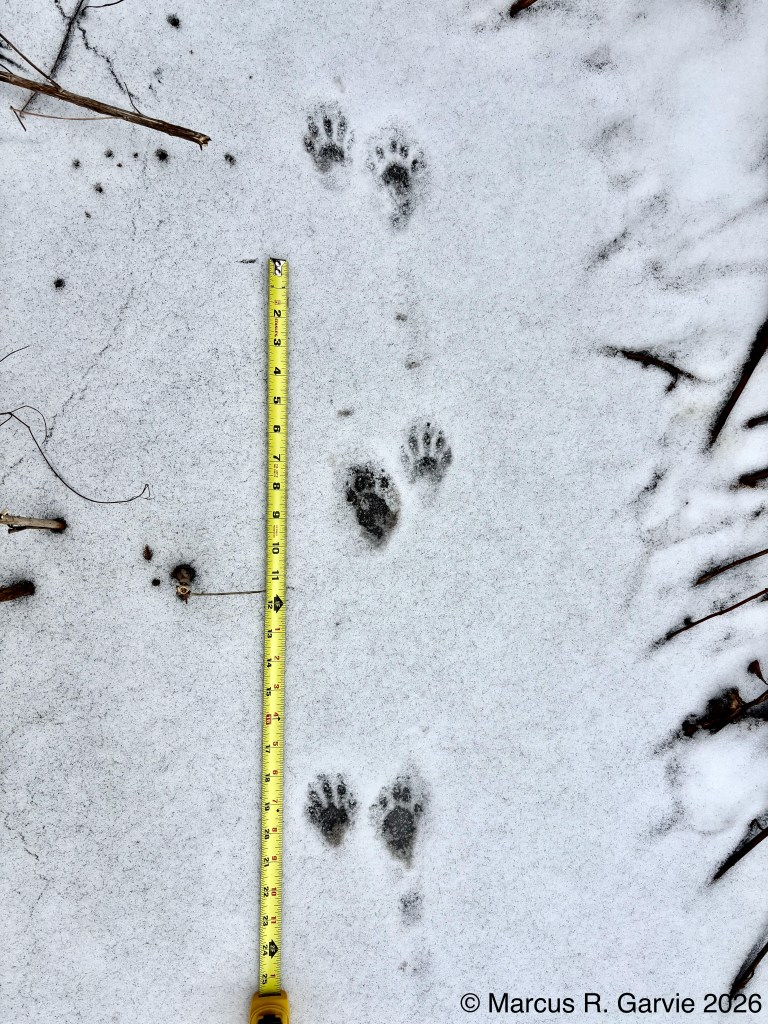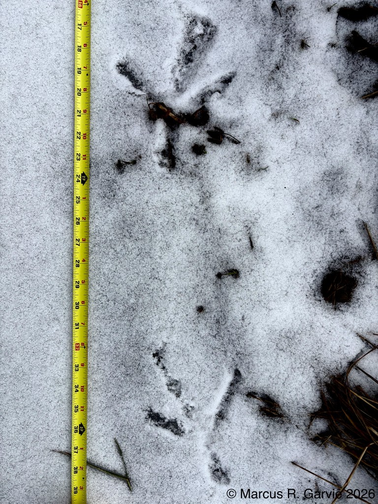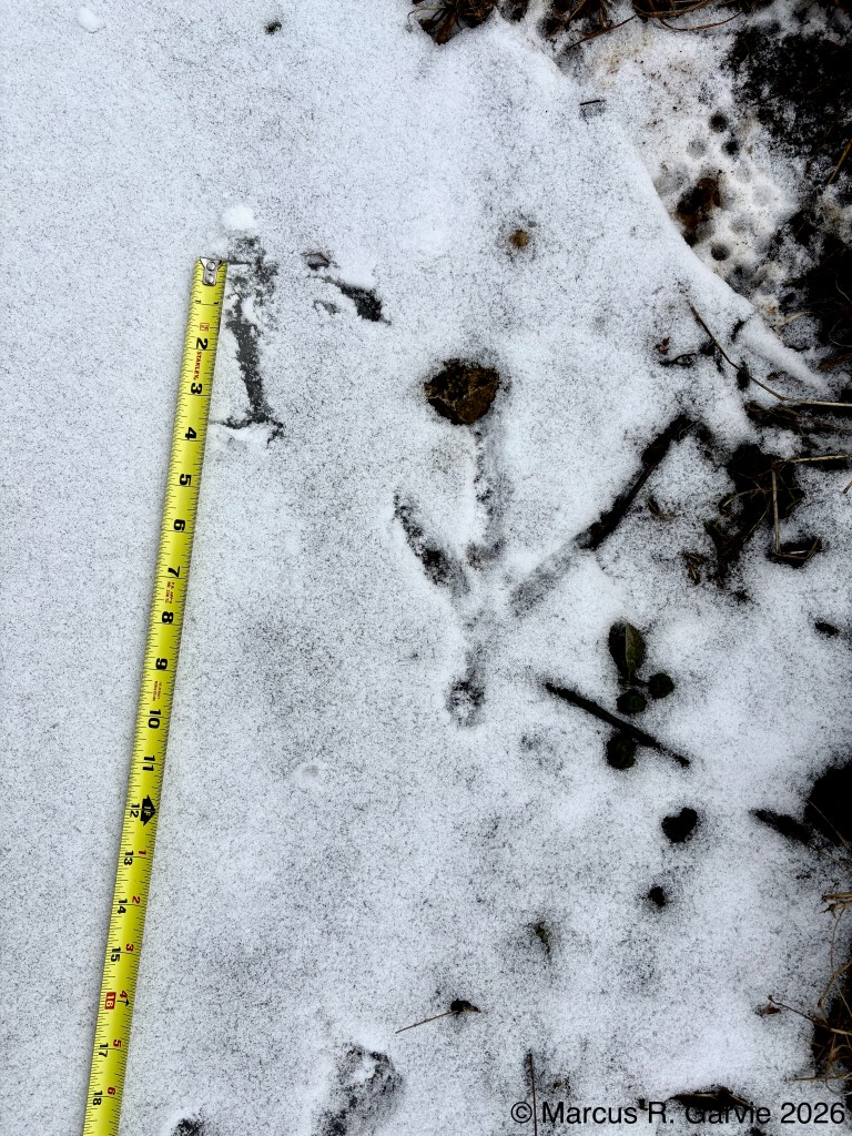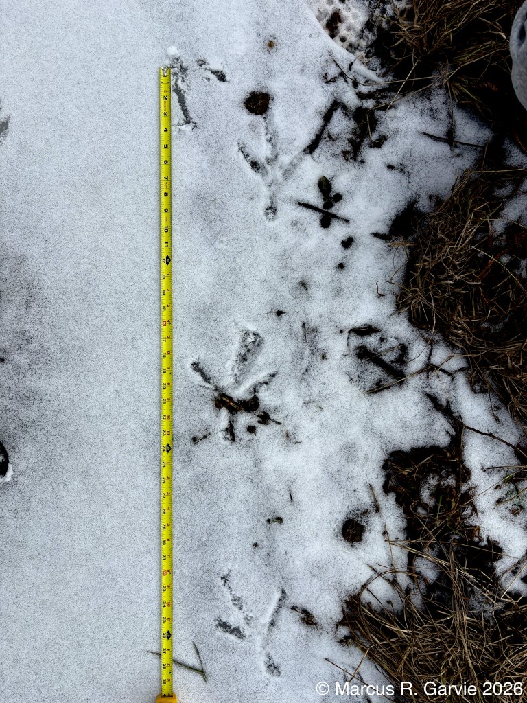 I returned to my route on the edge of the Speed River and found some additional late Winter observations, including the tracks of a large bird that shows partial migration in Southern Ontario.