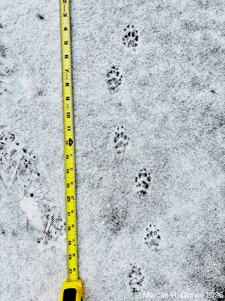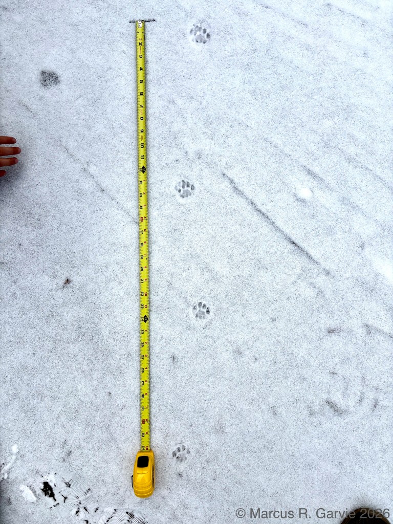2) the distance from one foot to the next placement of that same foot (double step) is about 23 inches. As I learned at a recent Track & Sign Certification, 2/3 of this distance yields roughly the the hip-to-shoulder length, i.e. about 15 in, which is roughly correct for my cat. (I checked afterwards, and the hip-to-shoulder length of my cat and it’s about 12 to 13 inches, which is roughly correct).