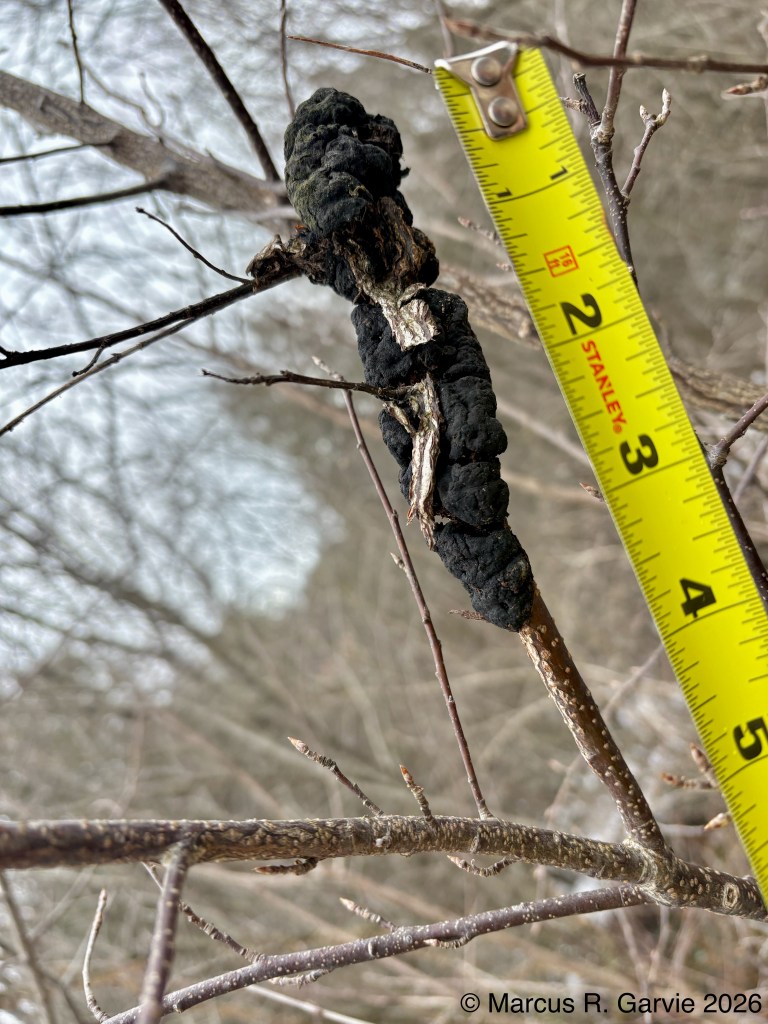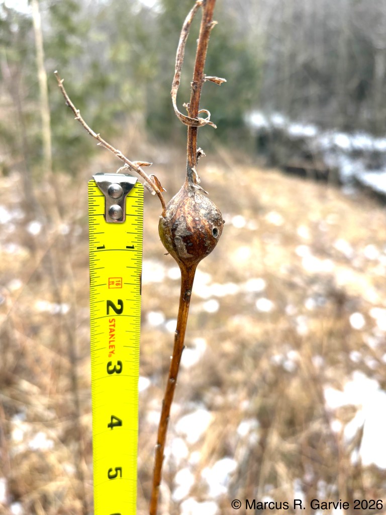 stem of the plant. If you look closely, I think we can see a small hole where the adult goldenrod gall fly likely emerged after overwintering inside the gall. In the second picture, black knot fungus appears as a hard, swollen black mass on the branch. It is a fungal disease of Prunus trees that is especially noticeable in fall and winter, and it can eventually girdle and kill the branch beyond the infection (see https://extension.umn.edu/plant-diseases/black-knot).