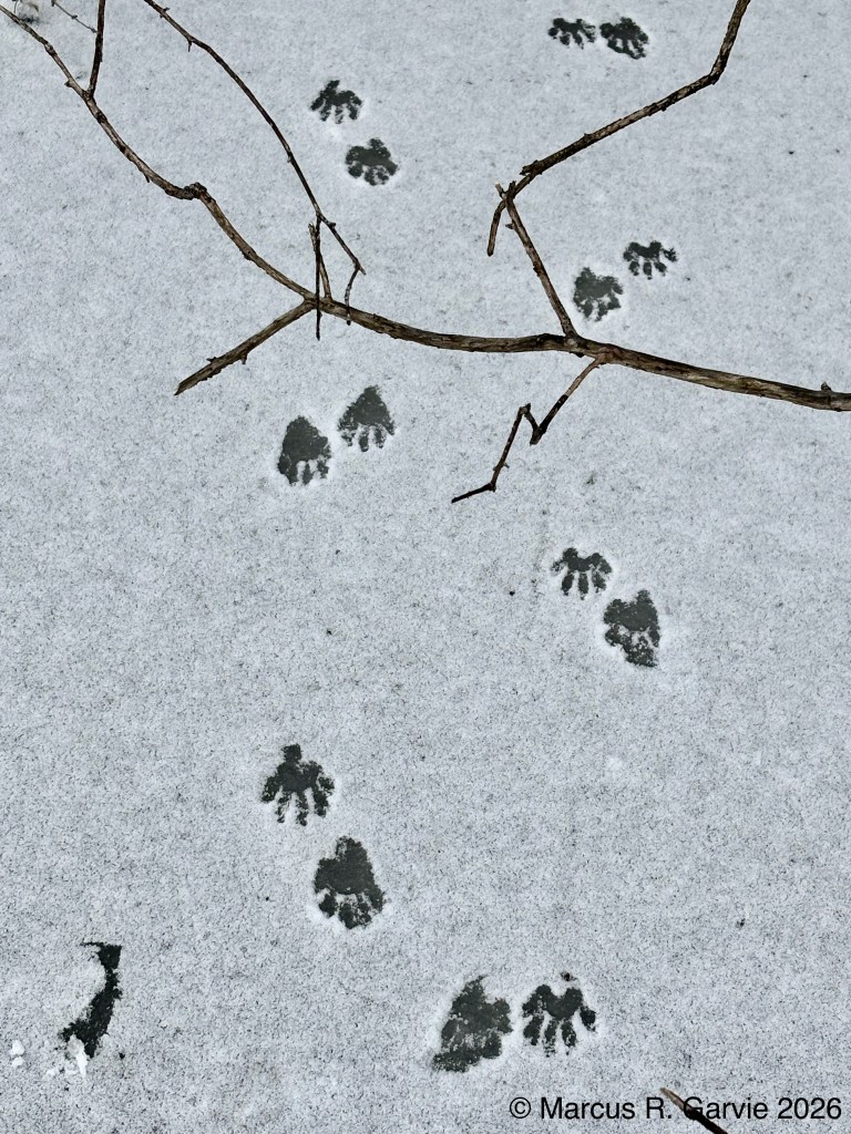 My next observations were raccoon tracks. No matter how many times I see them, I am always excited to do so. In this case, a raccoon, or perhaps more than one animal, was walking on a thin layer of snow over ice, giving the tracks wonderful contrast.