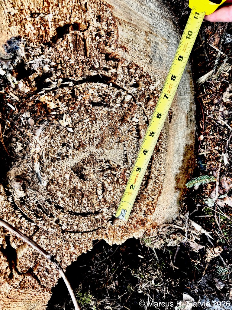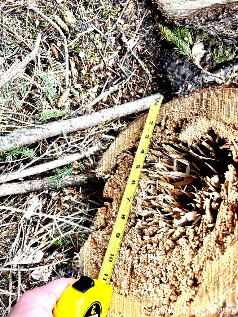 Finally, on the way back, we entered an area that had recently been cleared. The wood inside some of the cut trees was crumbly where Carpenter ants had made galleries: