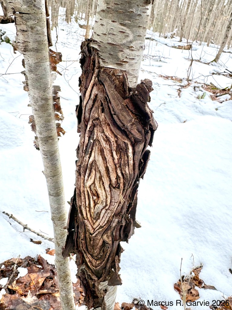 This is an example of what is called Beech Bark disease. Beech bark disease is a fatal forest condition caused by a two-step interaction between an invasive scale insect (Cryptococcus fagisuga) and a genus of fungus (Neonectria). The insect punctures the bark, allowing fungus to enter, creating cankers that girdle and kill trees. It affects American beech, appearing as white, woolly spots on the bark, see