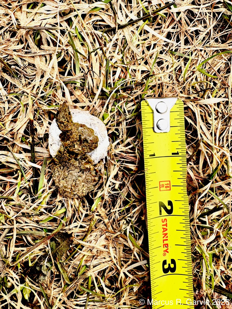 We started out on Alexis’s property, a several-acre parcel surrounded by farmers’ fields. Alexis has chickens, so I thought it would be fun to document their tracks and scat. Curiously, I could not find any good online sources with clear photos and descriptions of chicken tracks. (Not even in [2].)