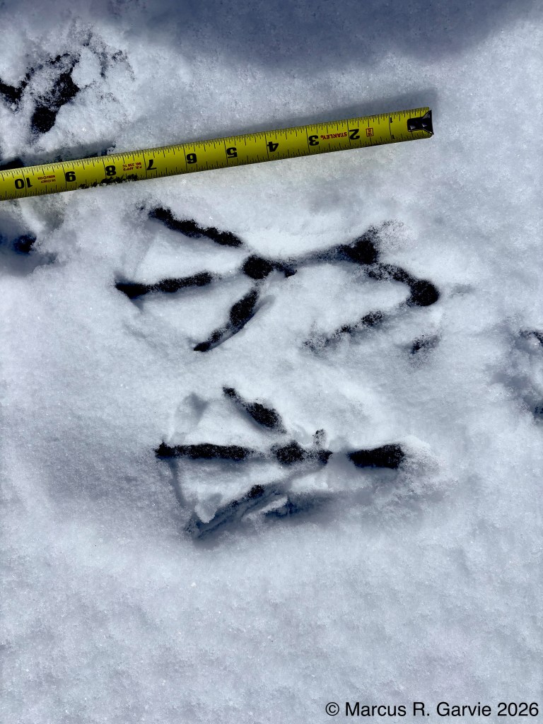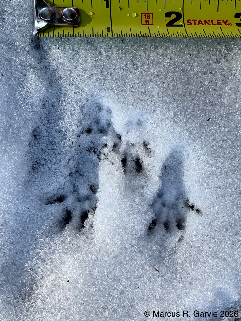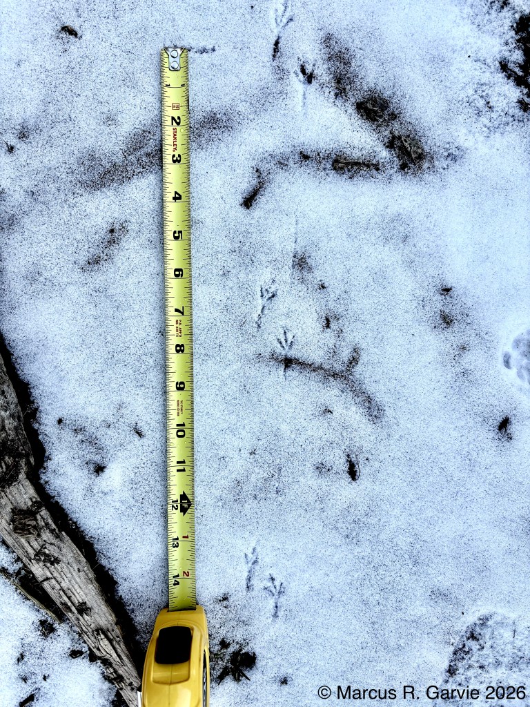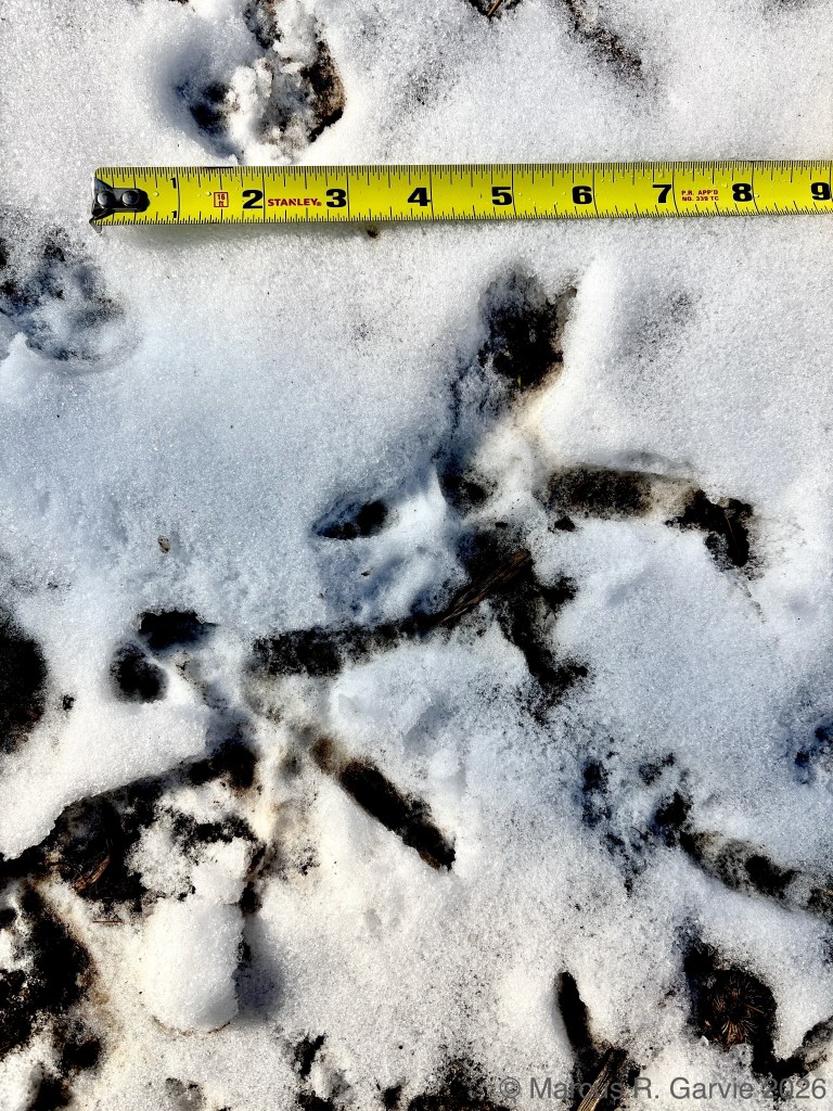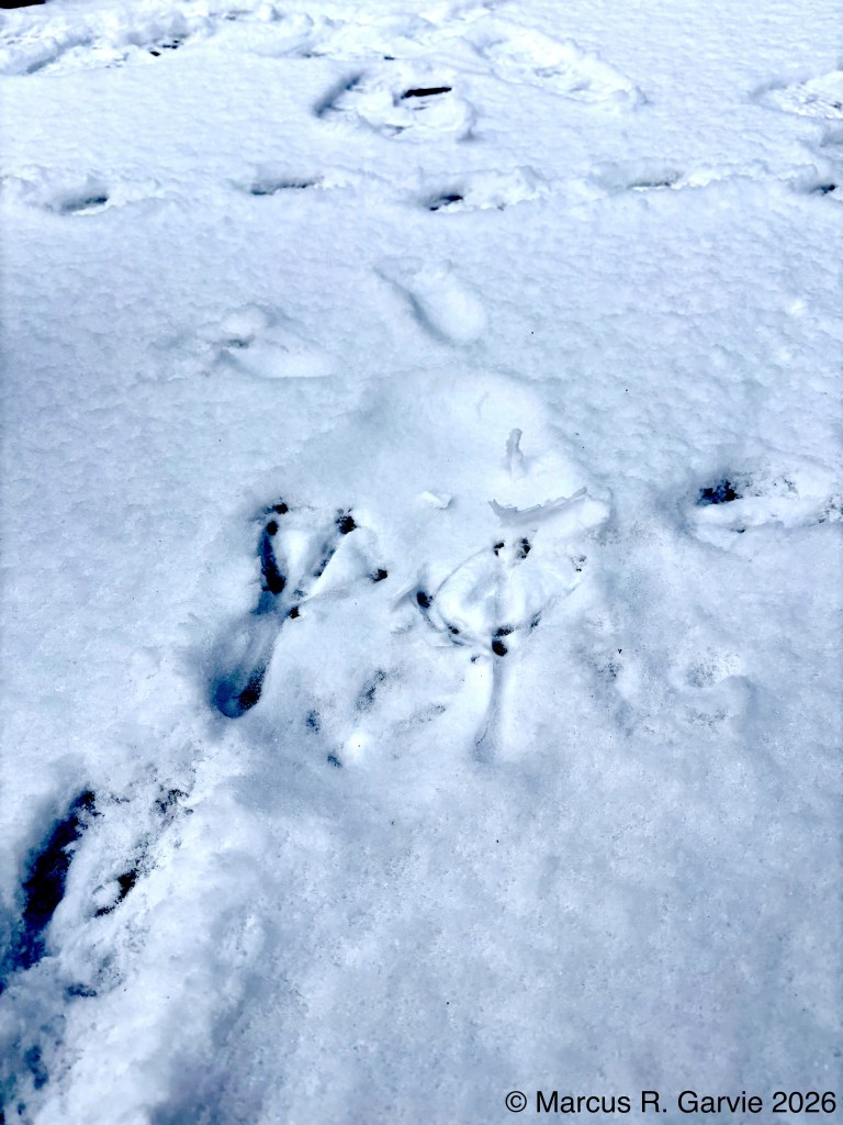 In case you were wondering, the other tracks are from a Striped Skunk! They were everywhere, and some of the tracks are very clear. Even though I have documented these tracks a few times, I can’t help showing them again. They are one of my favourite tracks: