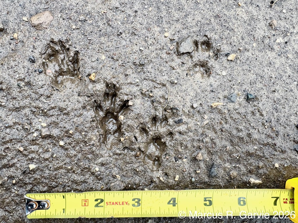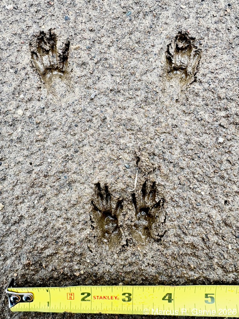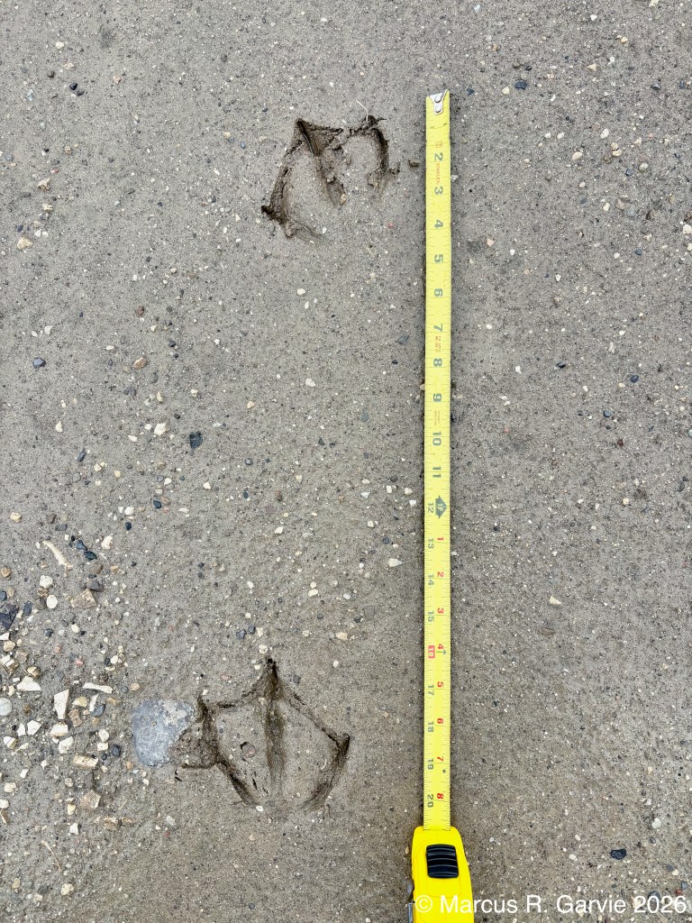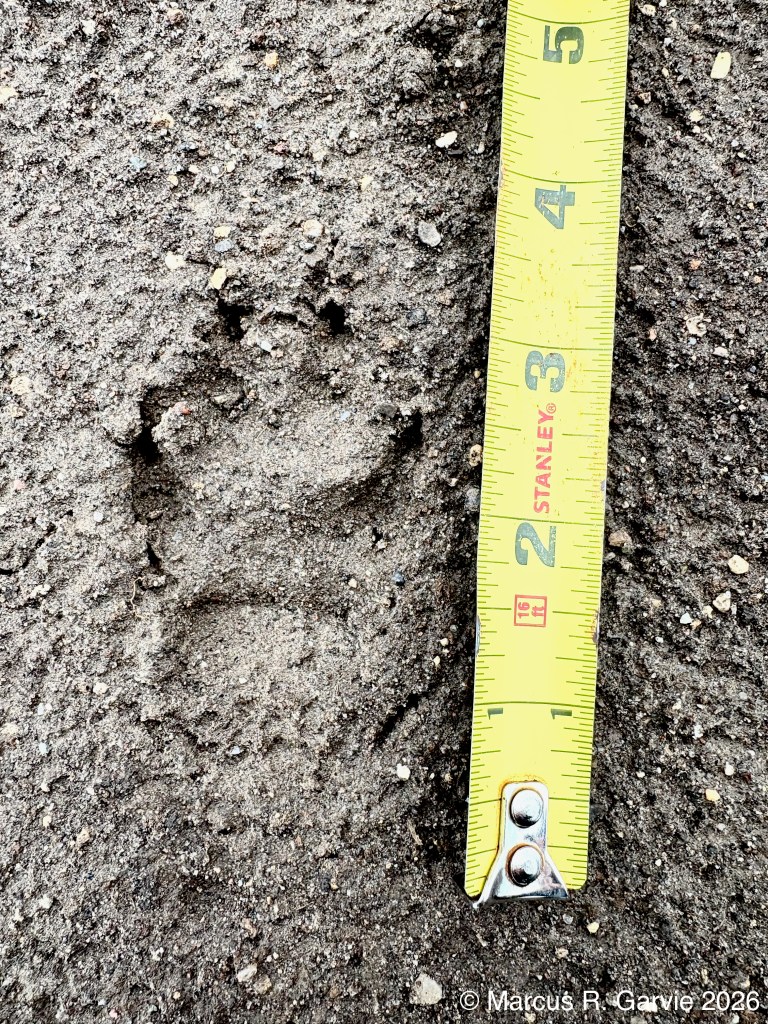 When I saw the next track, I thought it was from a domestic dog. But it seems atypical. Are we seeing the carpal pad impression at the track posterior because of the soft sediment?