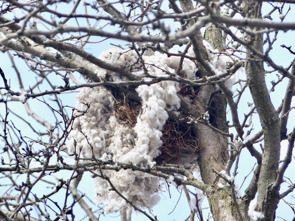 Nearby was their nest, perhaps 40 feet up in a deciduous tree near the crown. The nest contained a large amount of some kind of white, fluffy human-made material. According to the article referenced above, Merlins usually nest in old hawk, crow, or magpie nests in trees, about 10-60 feet above the ground, adding little or no material.