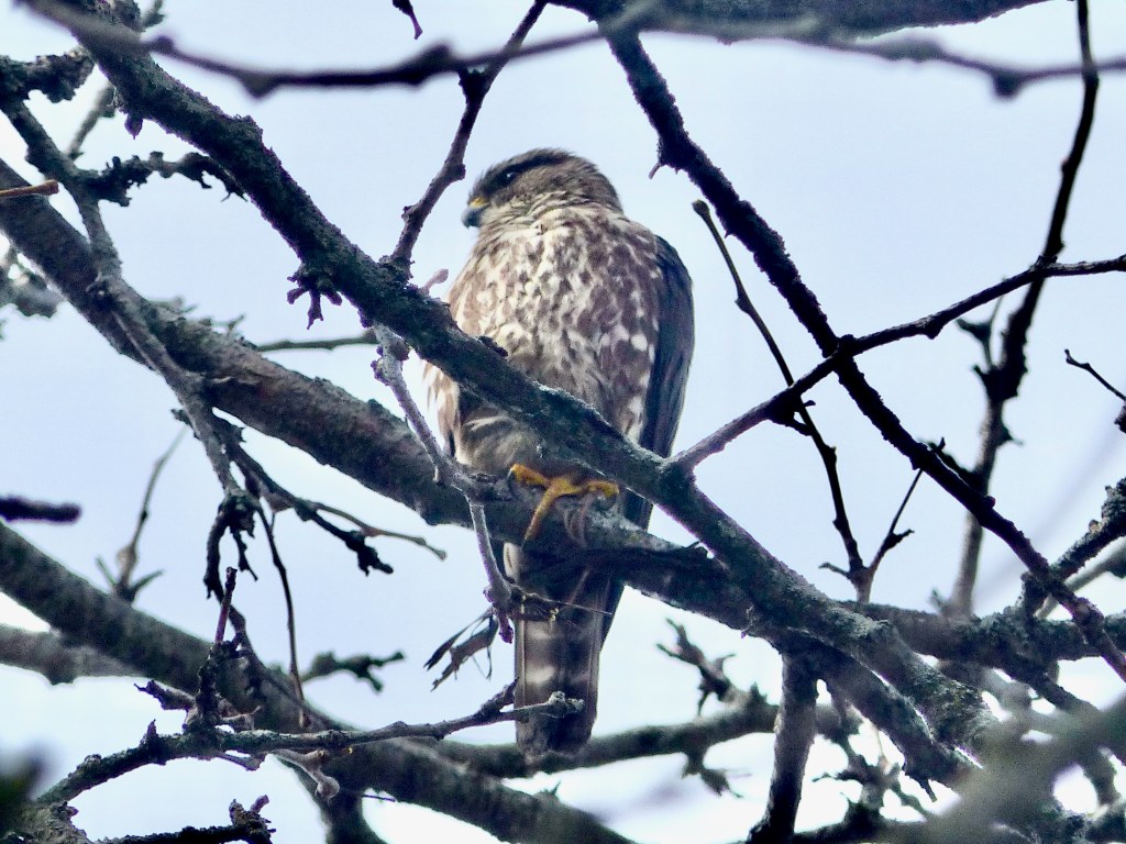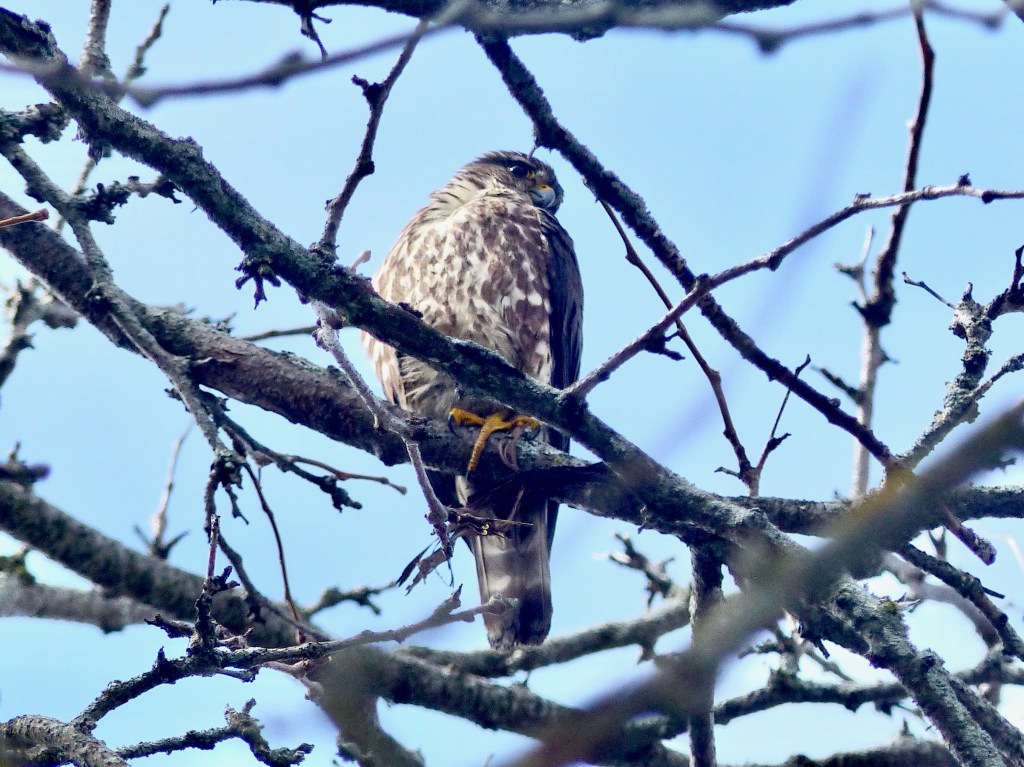 Finally, on my walk home through an urban area, I spotted a pair of Merlins while using my Merlin Bird ID app – LOL. The Merlin is a small, compact falcon that breeds across the northern forests of North America and Eurasia. It mainly hunts small birds in fast aerial pursuit and, since about 1960, has also become a common urban bird in some northern prairie towns, where it nests and winters while feeding largely on House Sparrows (see https://www.audubon.org/field-guide/bird/merlin).