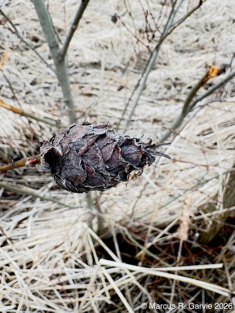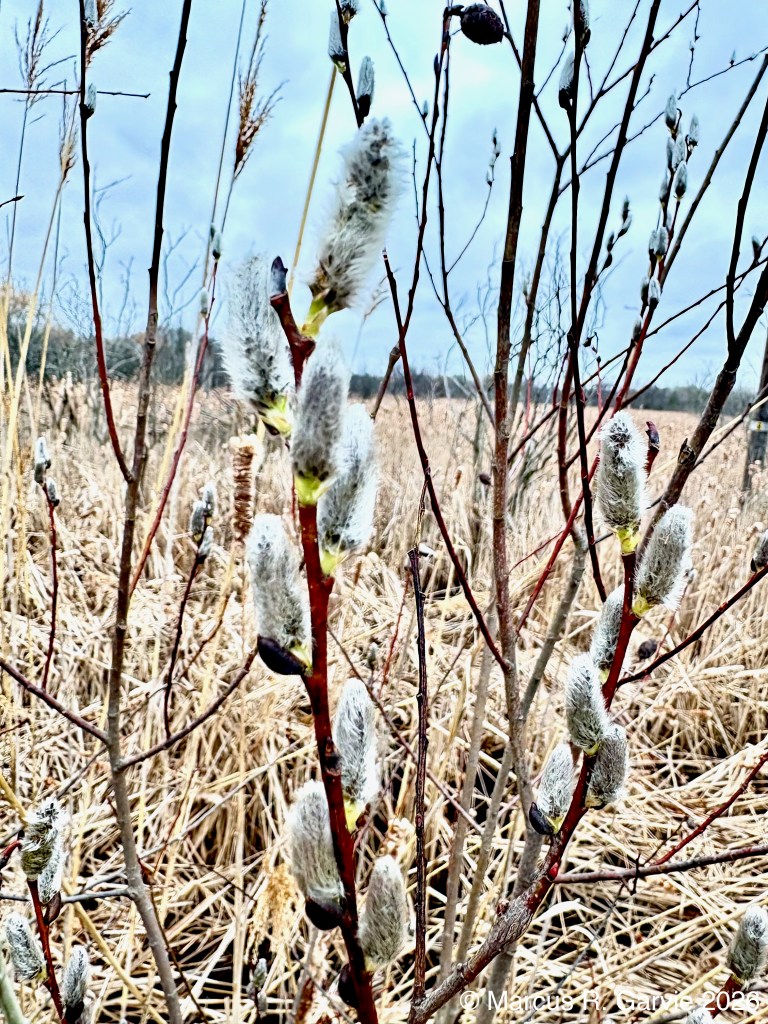 For the remainder of my walk I enjoyed some signs of Spring. Below I show a photo of some pussy willow (Salix discolor ?) and the associated Willow Pine Cone Gall: a distinctive, pine cone-shaped growth found on