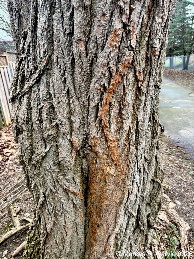 After visiting the muddy field, I continued my walk until I reached a path that passes through a cattail marsh and ultimately connects to Preservation Park. I found some bark sign on a black willow (?) that reminds me of gray squirrel sign I have seen before. The vertical stripes on the bark are likely due to scent and territorial marking by gray squirrels when they bite the bark, which is discussed on pages 599-601 of [1].